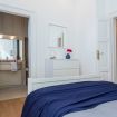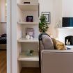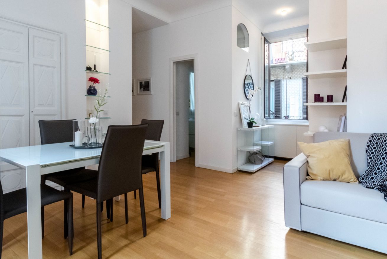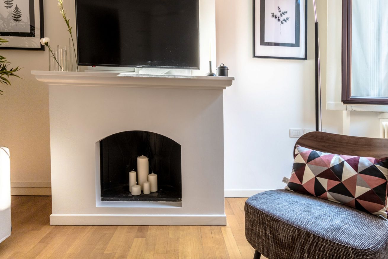 Elegante appartamento in complesso signorile al 3° piano senza ascensore, completamente climatizzato, dove luce naturale e dettagli ricercati definiscono un’atmosfera raffinata e accogliente. L’ingresso conduce a un’ampia zona living con parquet chiaro e arredi contemporanei: comodo divano letto, poltrone di design con linee moderne e tavolino minimal. Il suggestivo camino decorativo bianco, incorniciato da pareti candide e complementi curati, diventa elemento distintivo e scenografico, mentre la Smart TV completa l’area relax. La zona pranzo con tavolo laccato bianco e sedute scure crea un piacevole contrasto elegante.