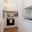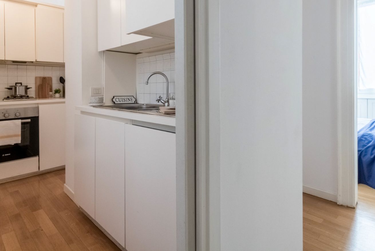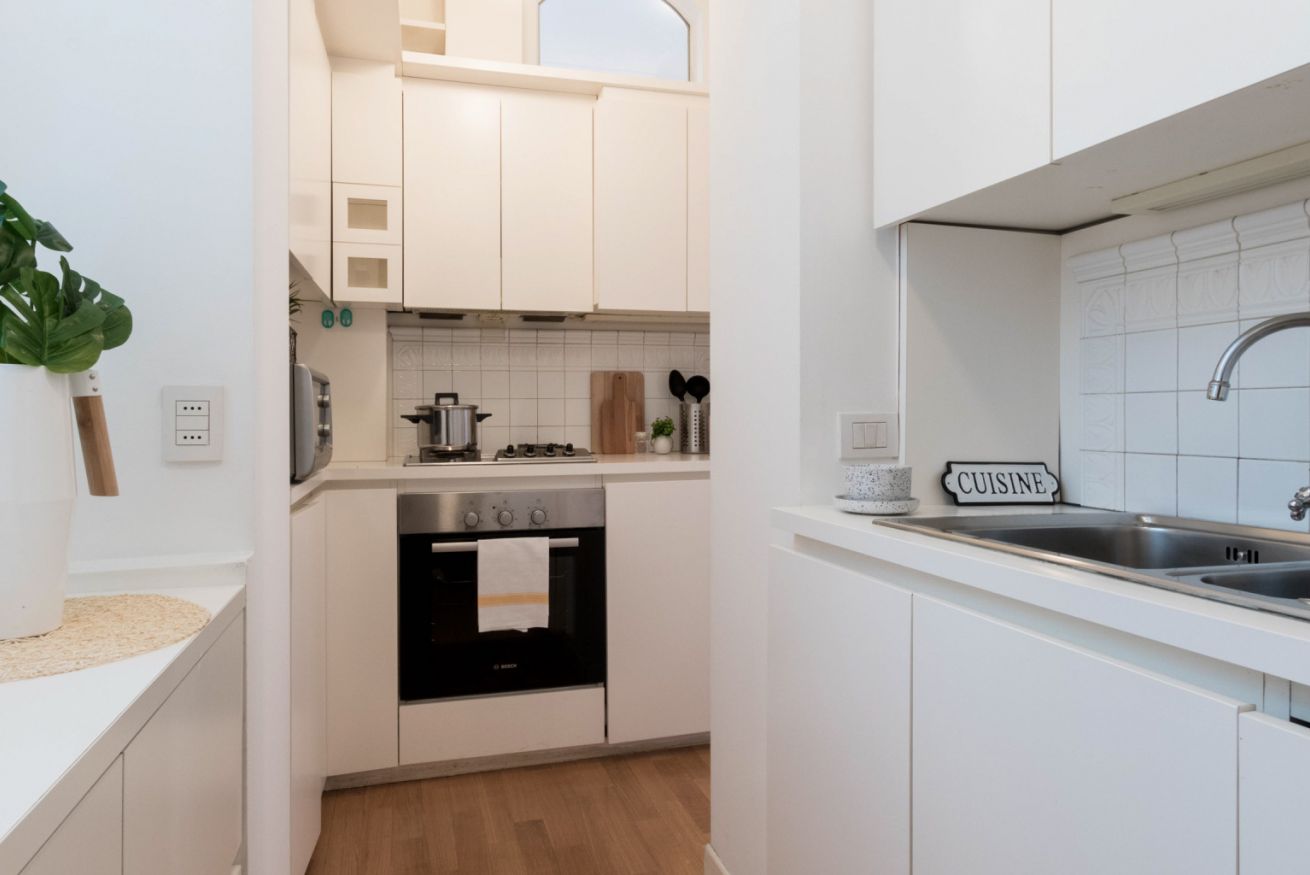 La cucina progettata su misura, separata e ben organizzata, è completa di forno, piano cottura, ampio lavello in acciaio e pratici spazi contenitivi. La camera matrimoniale è luminosa e armoniosa, impreziosita da mensole in vetro e dettagli decorativi, con bagno ensuite completo con doccia. La seconda camera con letto singolo è intima e funzionale, ideale anche come studio. Completa la proprietà un bagno di servizio con lavatrice, rifinito in tonalità calde. Una soluzione elegante, equilibrata e pronta da vivere nel cuore di Milano.