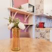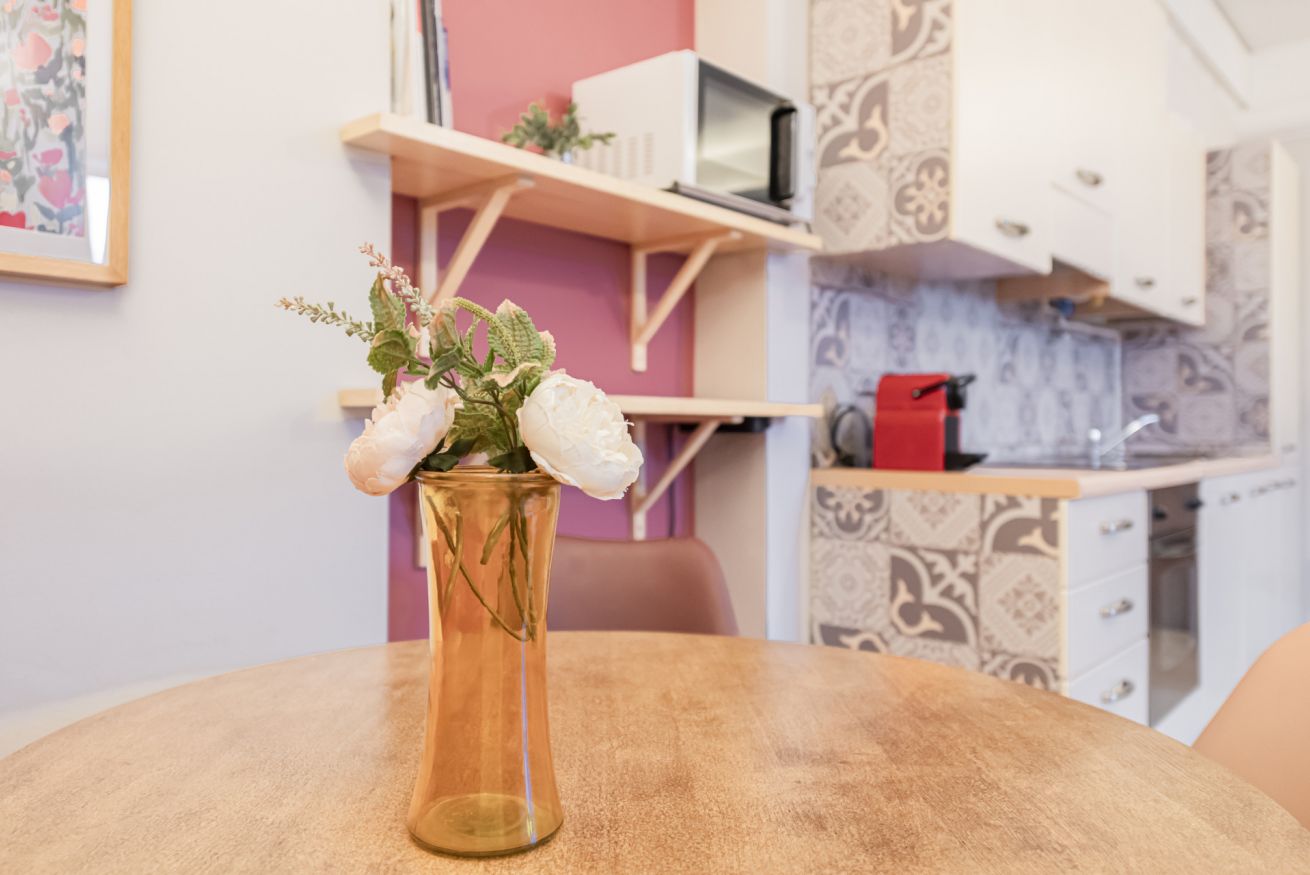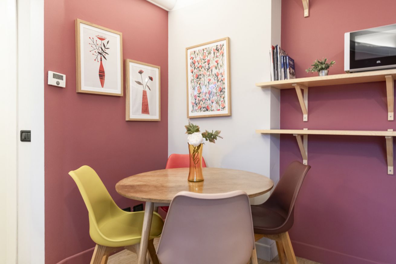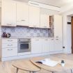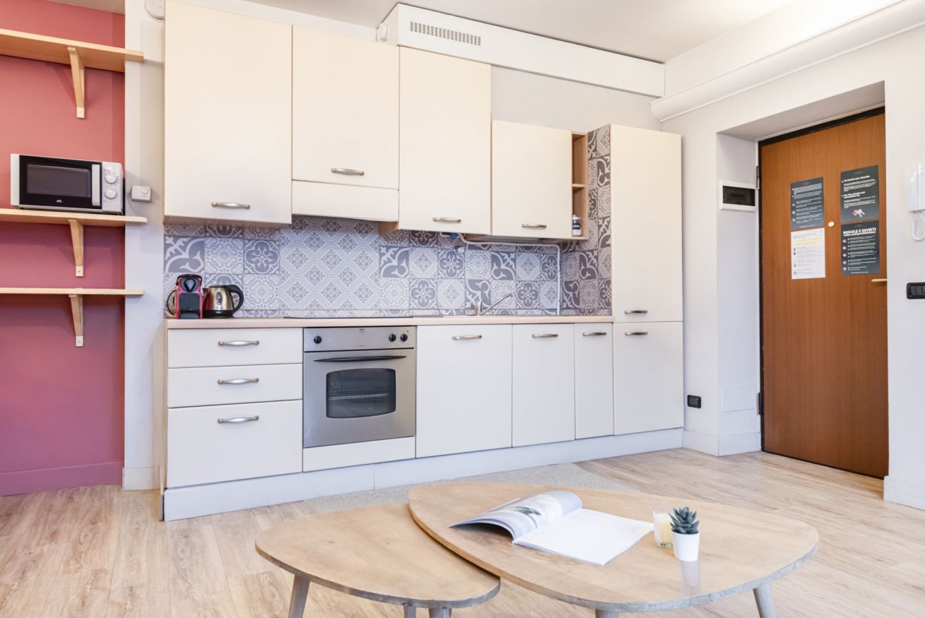 La cucina a vista, lineare e ben organizzata, presenta mobili chiari, piano di lavoro funzionale, forno integrato e piano cottura, con alzatina decorata che aggiunge un tocco di stile. Accanto, la zona pranzo ospita un tavolo rotondo in legno con sedute colorate, perfetto per momenti conviviali.