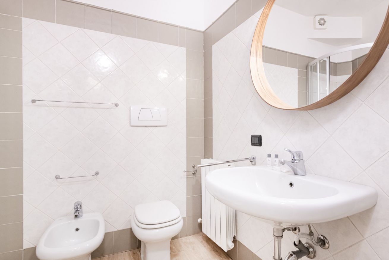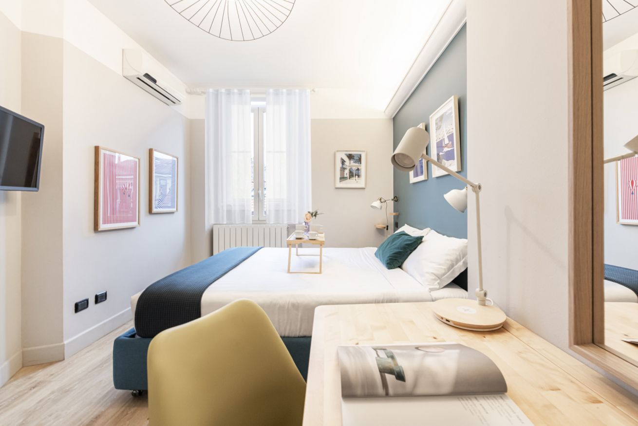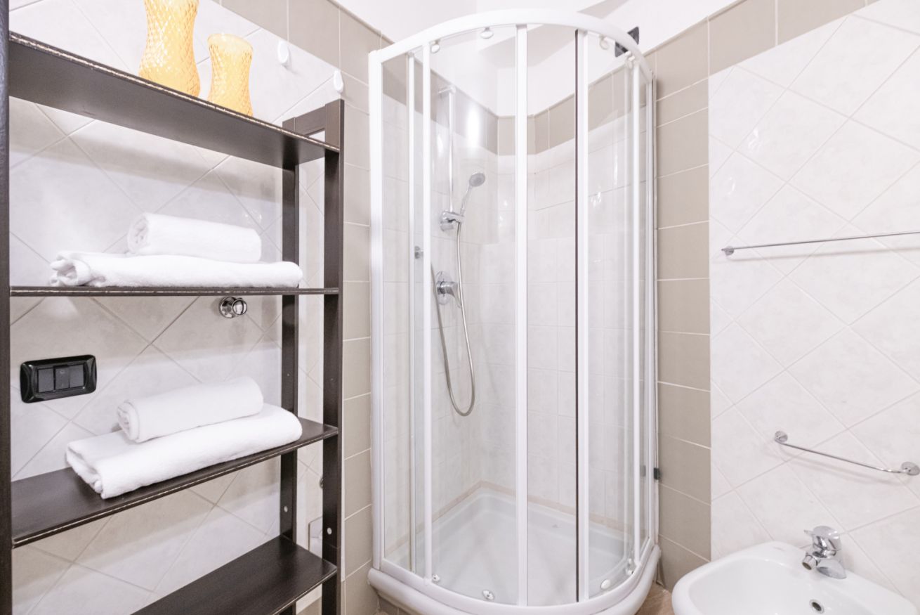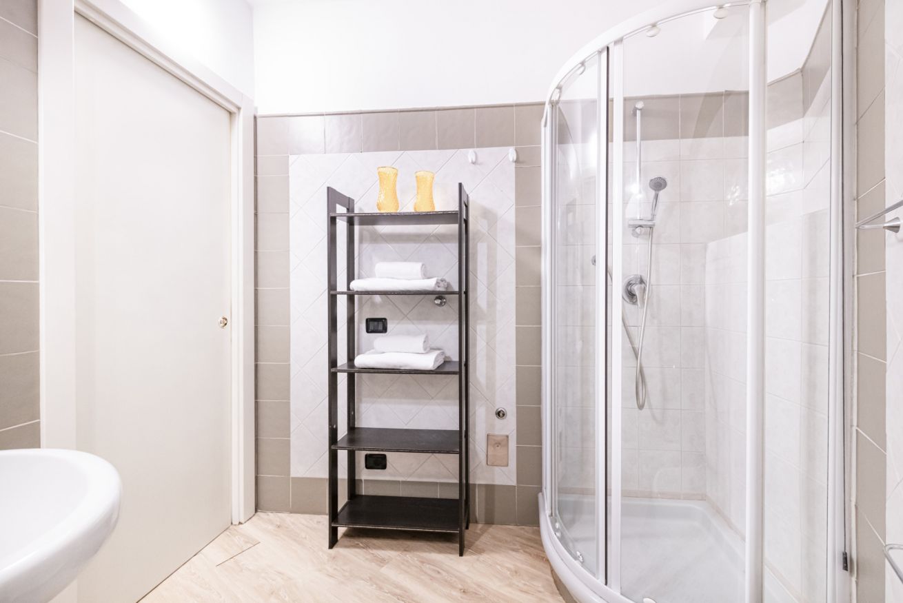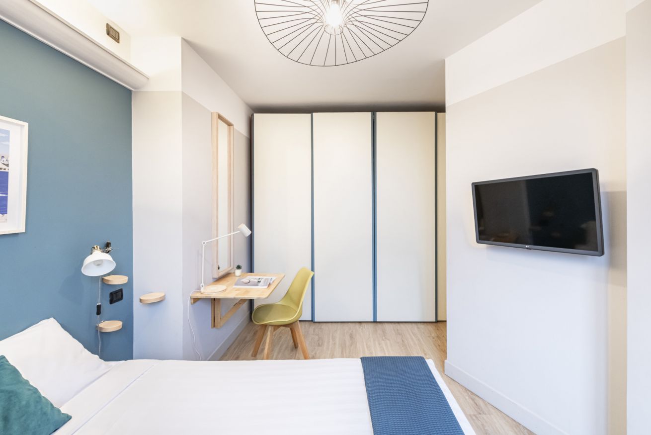 La camera matrimoniale è elegante e rilassante, con parete d’accento verde petrolio, letto matrimoniale, armadio a tutta altezza, angolo studio con scrivania e sedia, oltre a TV a parete. Il bagno è ampio e luminoso, rifinito con piastrelle chiare, dotato di box doccia, sanitari completi, lavabo con specchio e pratici spazi contenitivi. Una soluzione curata e funzionale, ideale per un soggiorno confortevole a Milano.