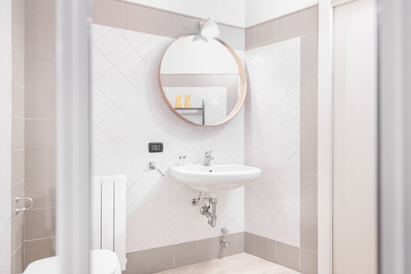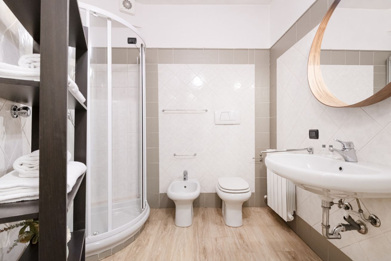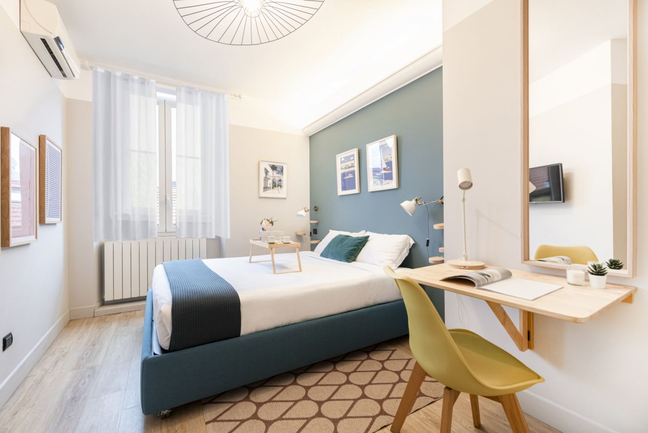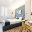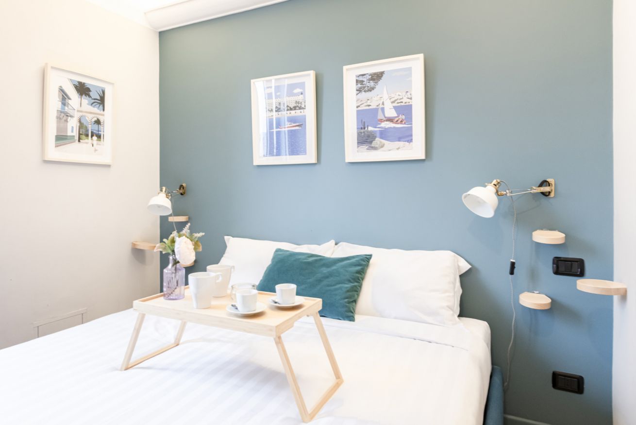 La camera matrimoniale è elegante e rilassante, con parete d’accento verde petrolio, letto matrimoniale, armadio a tutta altezza, angolo studio con scrivania e sedia, oltre a TV a parete. Il bagno è ampio e luminoso, rifinito con piastrelle chiare, dotato di box doccia, sanitari completi, lavabo con specchio e pratici spazi contenitivi. Una soluzione curata e funzionale, ideale per un soggiorno confortevole a Milano.
