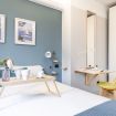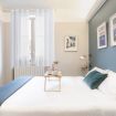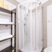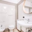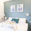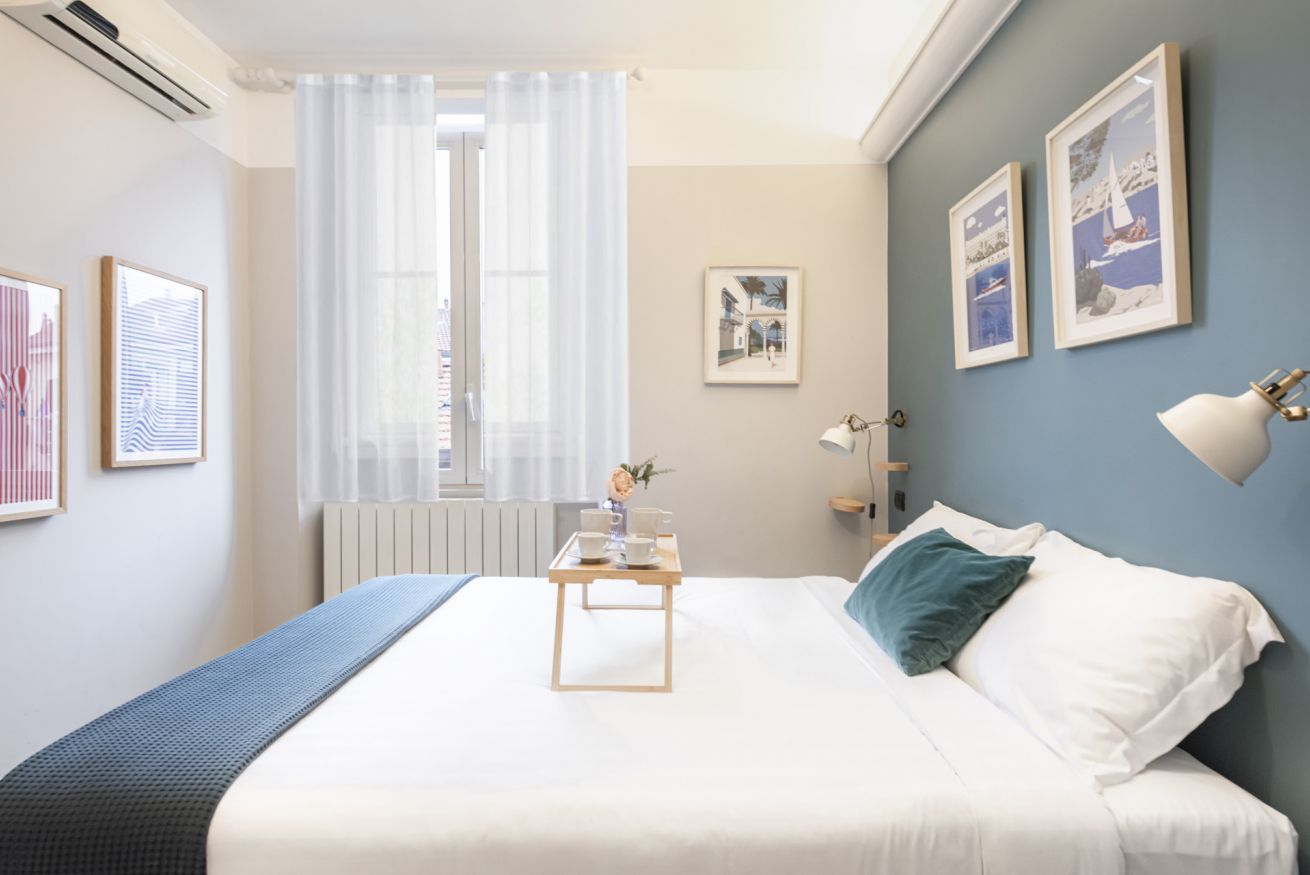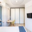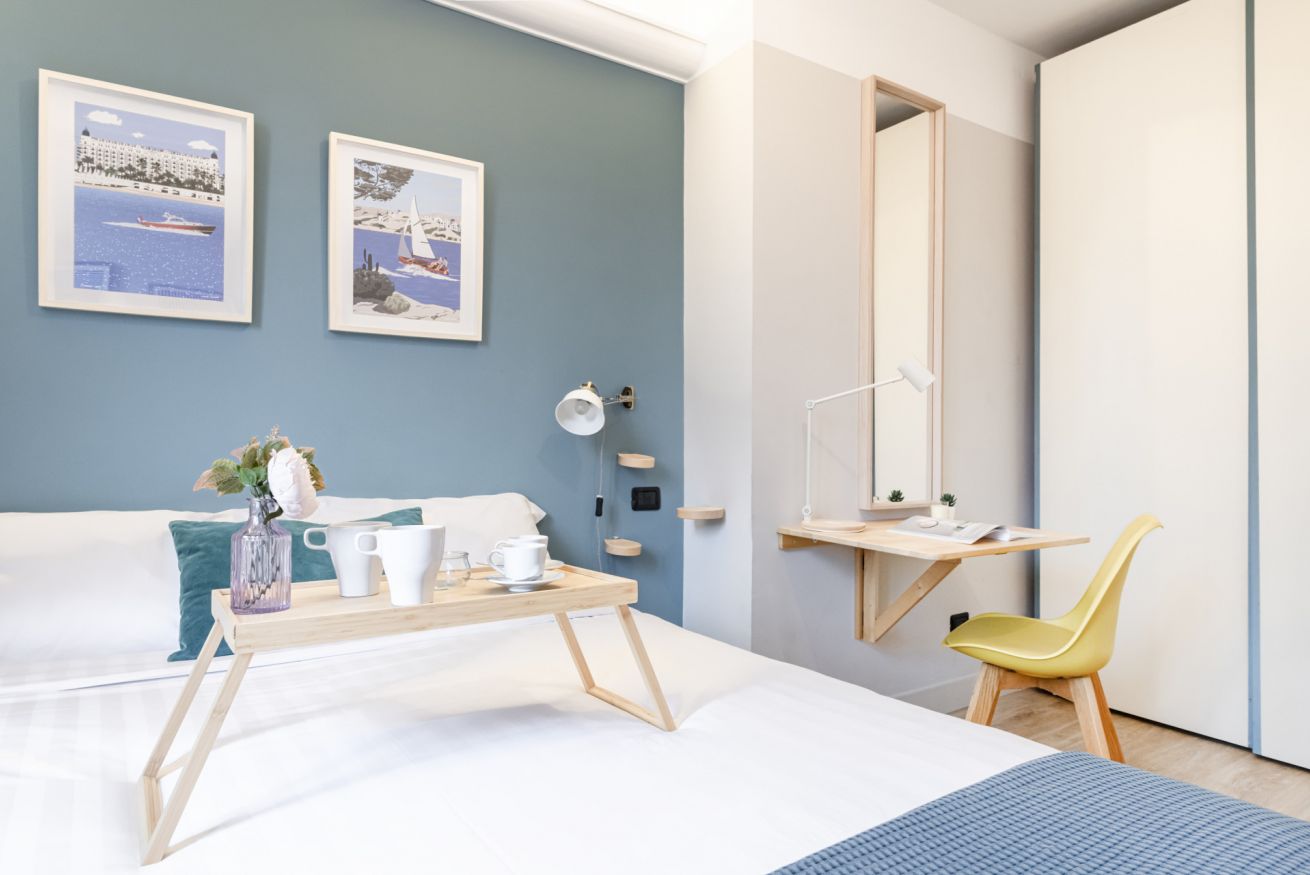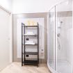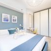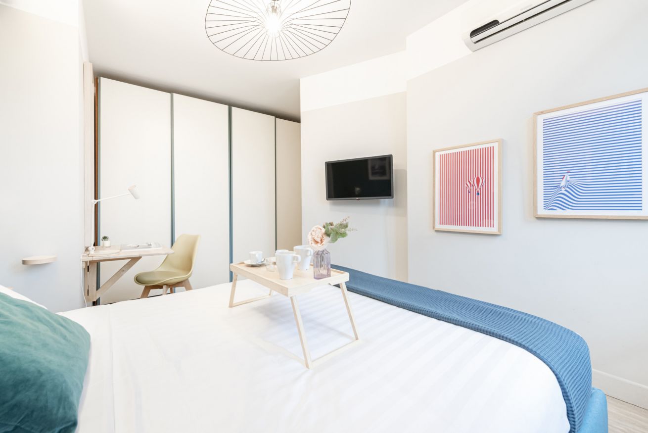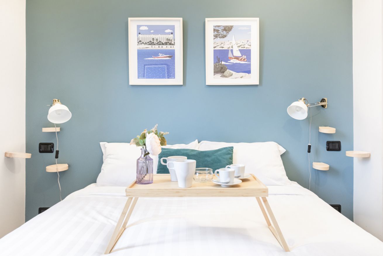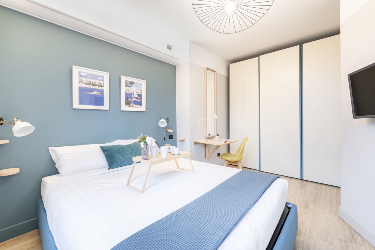 La camera matrimoniale è elegante e rilassante, con parete d’accento verde petrolio, letto matrimoniale, armadio a tutta altezza, angolo studio con scrivania e sedia, oltre a TV a parete. Il bagno è ampio e luminoso, rifinito con piastrelle chiare, dotato di box doccia, sanitari completi, lavabo con specchio e pratici spazi contenitivi. Una soluzione curata e funzionale, ideale per un soggiorno confortevole a Milano.