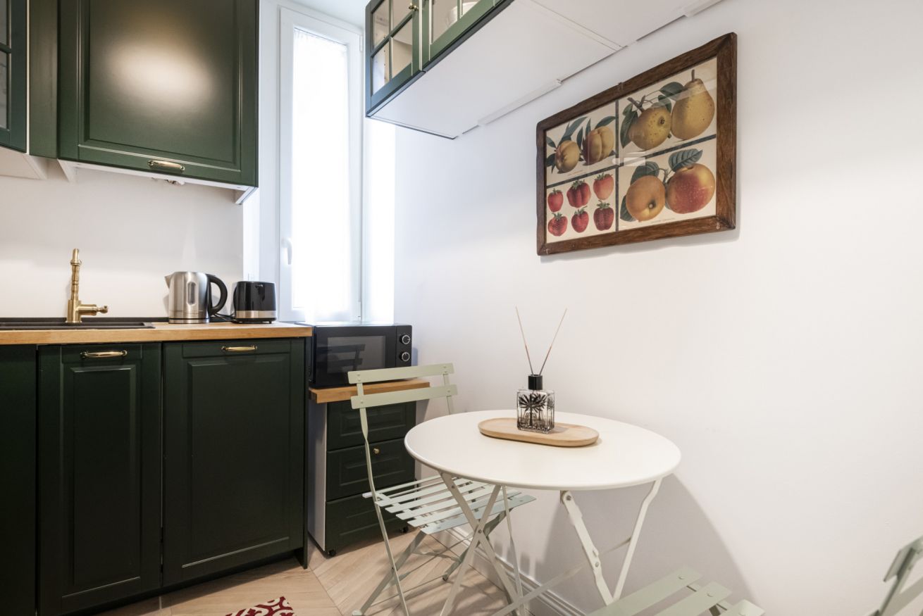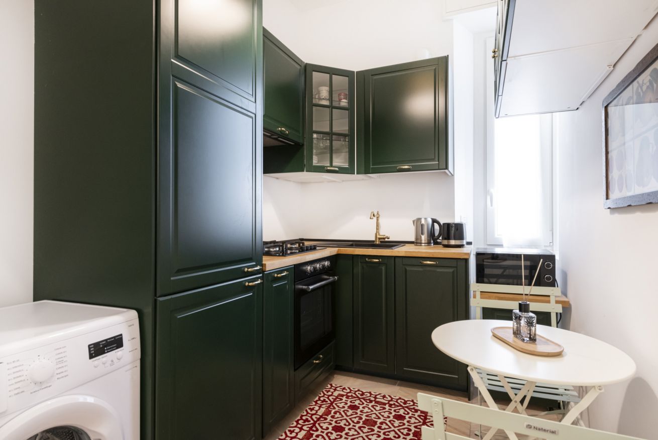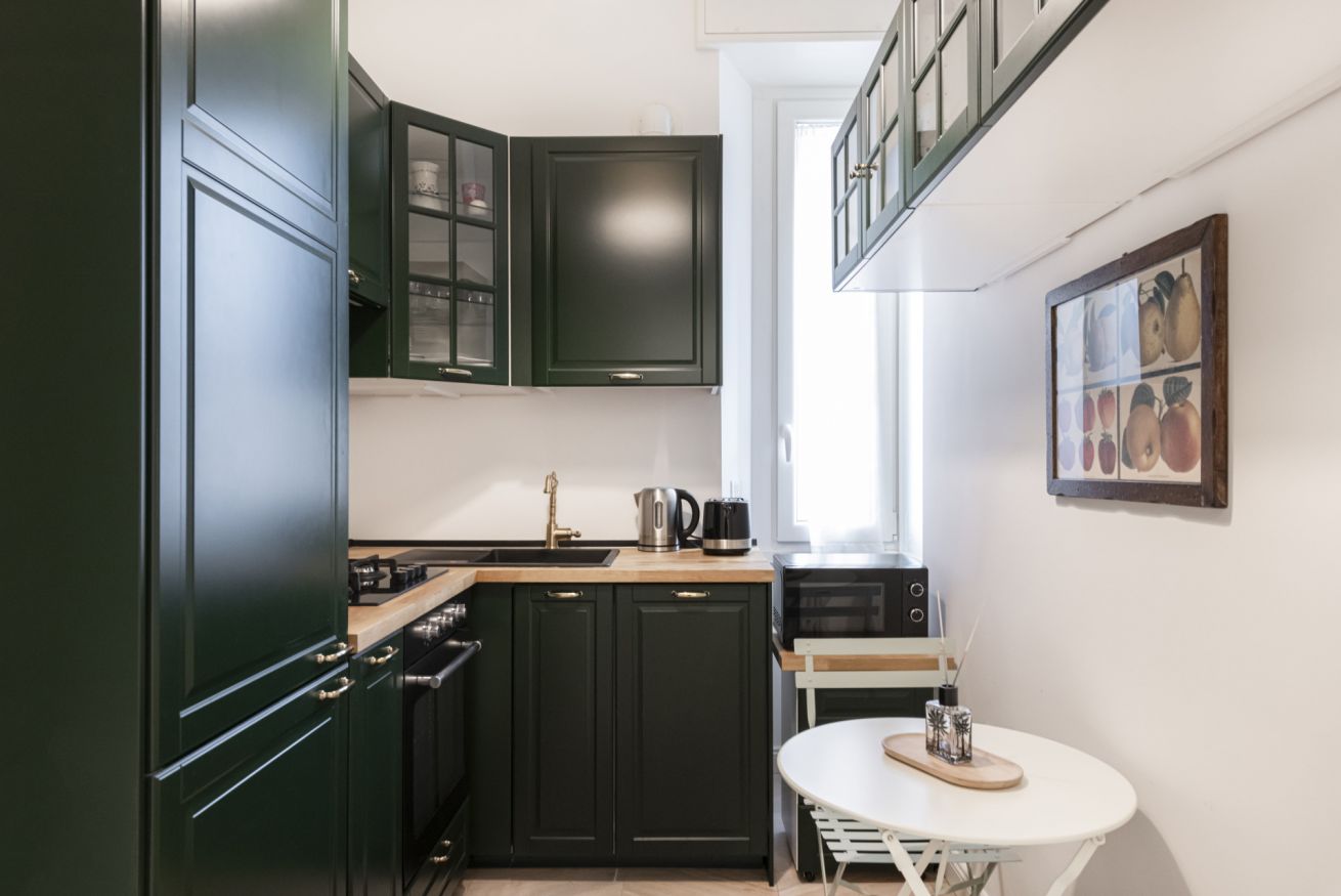 La cucina angolare, completamente progettata su misura, è uno dei punti di forza dell’appartamento. Dotata di elettrodomestici di qualità e caratterizzata da un design armonioso, unisce funzionalità e estetica, offrendo uno spazio organizzato e perfettamente attrezzato per chi ama cucinare o desidera semplicemente sentirsi a casa, anche lontano da casa.