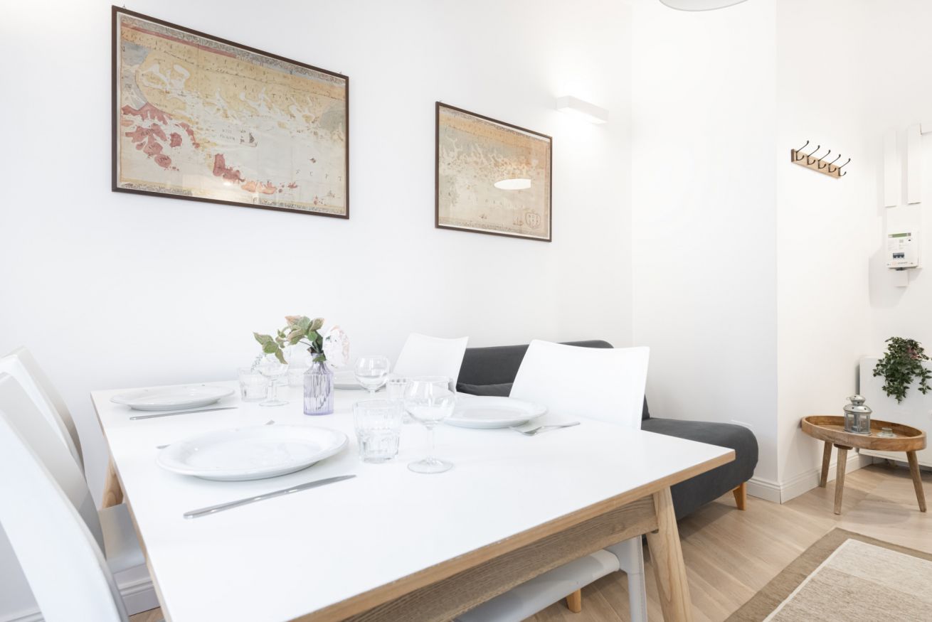 L’ingresso introduce in una splendida zona living, ampia e luminosa, dove un comodo divano invita al relax e una smart TV a parete offre intrattenimento moderno e immediato. La zona pranzo, perfettamente integrata, crea uno spazio conviviale ideale sia per pasti quotidiani sia per momenti di convivialità. L’atmosfera, elegante e ben equilibrata, rende l’ambiente piacevole da vivere in ogni momento della giornata.
