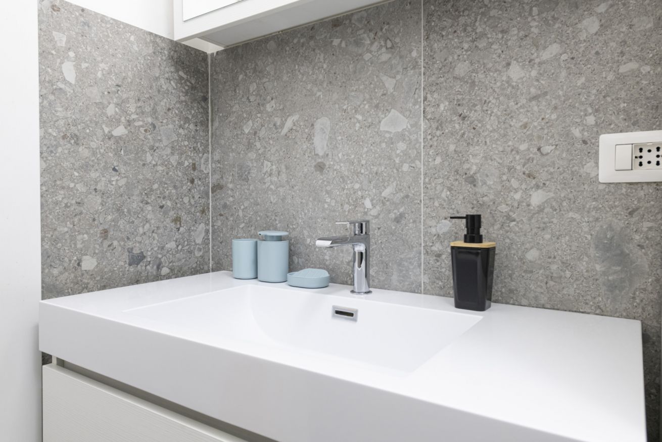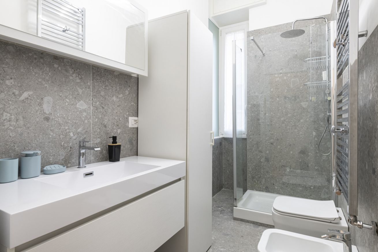 Il bagno, moderno e rifinito con gusto, presenta una splendida doccia walk-in in vetro, ampia e luminosa, che trasforma la routine quotidiana in un vero momento di benessere. Le finiture eleganti e le linee pulite contribuiscono a un ambiente rilassante e contemporaneo.