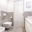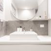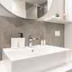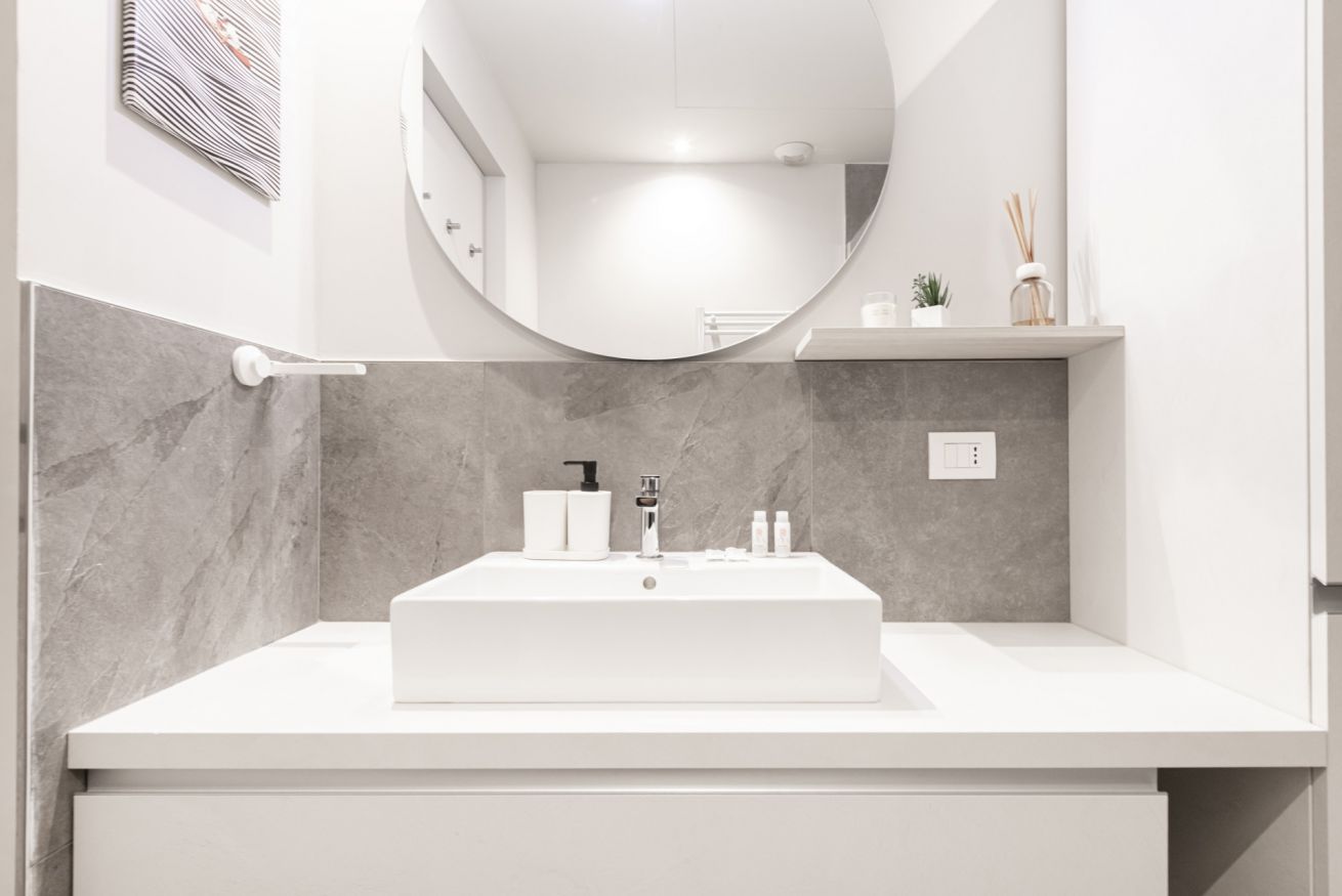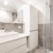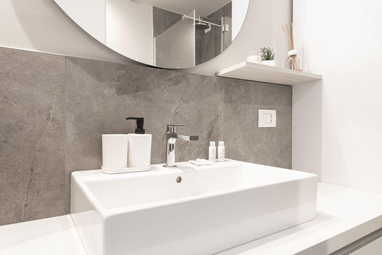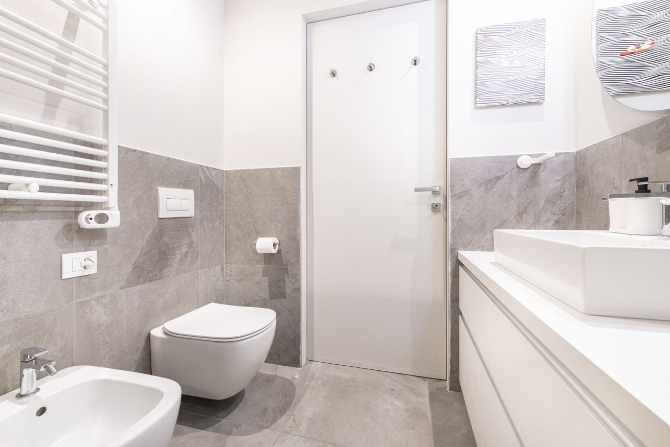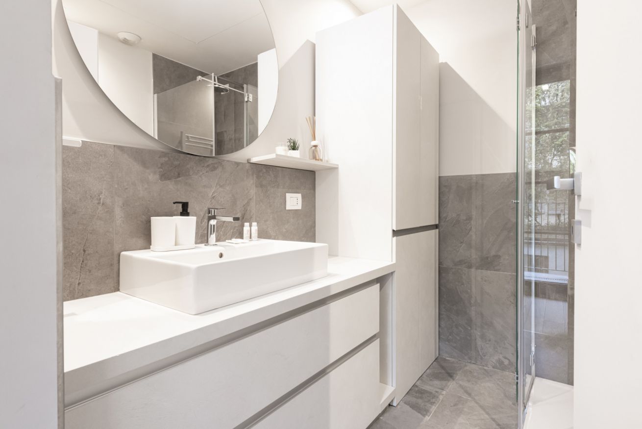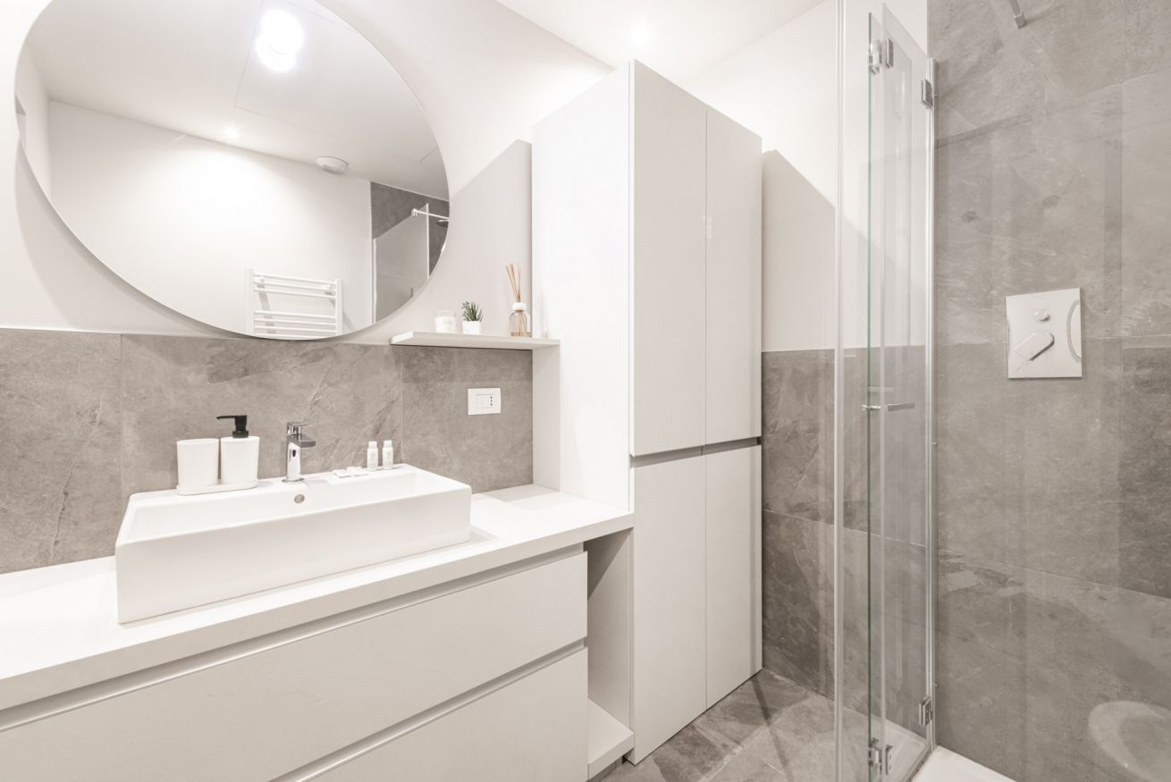 Il bagno, elegante e ben proporzionato, è rifinito con materiali di qualità e dotato di una spaziosa doccia in vetro. Una soluzione ideale per chi cerca stile, praticità e un’abitazione curata in ogni dettaglio.