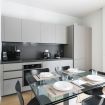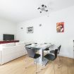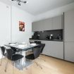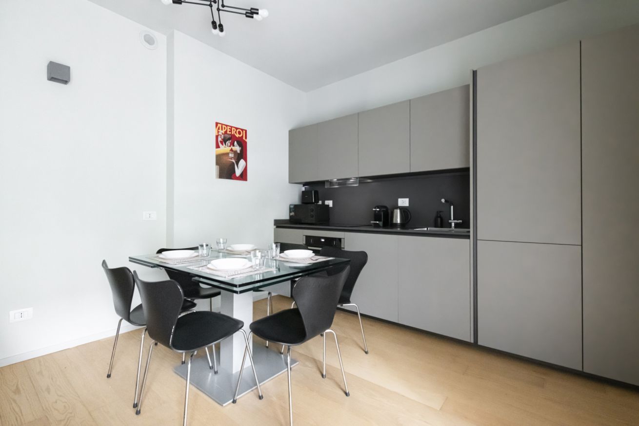 La zona pranzo, armoniosamente integrata, dialoga con una cucina lineare di nuova realizzazione, realizzata su misura e completa di elettrodomestici moderni, perfetta per soggiorni all’insegna del comfort e della funzionalità.