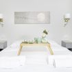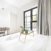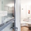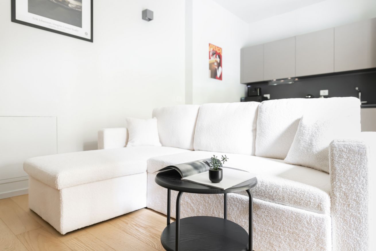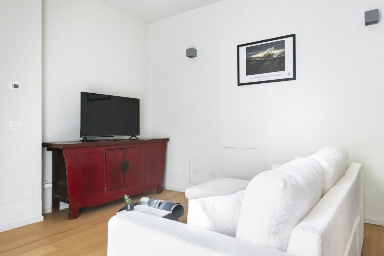 L’ingresso si apre su una raffinata zona living, luminosa e accogliente, caratterizzata da un ampio divano letto con penisola, smart TV e grandi superfici vetrate che garantiscono luce naturale e continuità visiva.