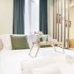 L'appartamento, recentemente ristrutturato con materiali di alta qualità, offre un ambiente raffinato e funzionale. L'ingresso conduce a una luminosa zona living, arredata con un comodo divano letto singolo e una zona pranzo accogliente. La cucina angolare, progettata su misura, è completa di elettrodomestici moderni, ideali per soddisfare ogni esigenza culinaria.​