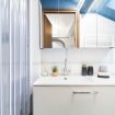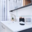 L’angolo cottura integrato è un paradigma di funzionalità e stile, con elettrodomestici che si fondono senza sforzo con l’arredamento moderno e una zona pranzo adiacente che invita a momenti conviviali. Il tavolo, posizionato strategicamente sotto un'illuminazione soffusa, è l’ideale per cene intime o rapide colazioni.