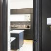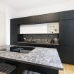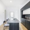 Adiacente, troviamo una splendida cucina lineare dal design contemporaneo, completamente attrezzata con elettrodomestici di ultima generazione, arricchita da una penisola operativa con piano cottura a induzione integrato, perfetta per cucinare e consumare i pasti in modo conviviale grazie ai comodi sgabelli in stile moderno.