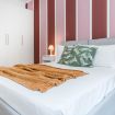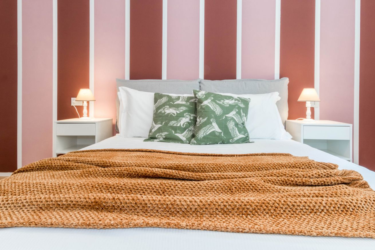 La camera matrimoniale, ampia e ben proporzionata, è impreziosita da una parete decorativa di carattere e da un ampio armadio a muro che garantisce ordine e praticità, mentre i tessili e i dettagli d’arredo creano un ambiente intimo e rilassante. Il bagno, moderno e funzionale, è dotato di una spaziosa doccia e finiture contemporanee che assicurano comfort quotidiano.