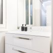 La zona notte comprende due camere pensate per offrire privacy e design. La prima, accogliente e funzionale, è arredata con due letti singoli e un armadio, perfetta per ospiti o figli. Affiancata, un bagno completo dotato di spaziosa cabina doccia in vetro un concentrato di estetica e comfort. La camera matrimoniale, luminosa e silenziosa, offre un generoso armadio a muro e si affaccia a un secondo bagno, questa volta arricchito da una vasca: un angolo di benessere riservato al relax assoluto.