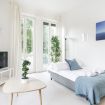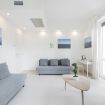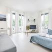 Si accede poi a un living illuminato dalla luce naturale che filtra attraverso il balcone, completo di ampi divani uno dei quali si trasforma in letto e smart TV, un angolo perfetto per momenti di convivialità, relax o intrattenimento. Da qui, una cucina abitabile su misura si distingue per eleganza e funzionalità: piano di lavoro, zona pranzo conviviale e elettrodomestici.