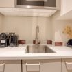 Varcando la soglia d'ingresso, si accede a una luminosa zona living, arredata con un comodo divano letto e una grande smart TV, ideale per momenti di relax o intrattenimento. La zona pranzo, armoniosamente integrata, offre uno spazio conviviale raffinato, mentre l'adiacente angolo cottura, progettato su misura, è dotato di elettrodomestici di ultima generazione che coniugano funzionalità e design.