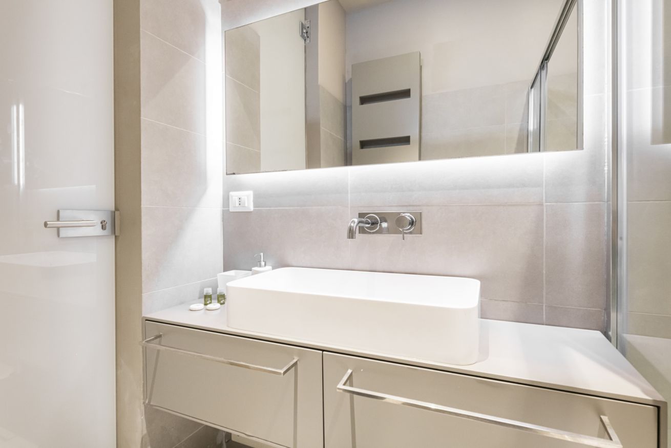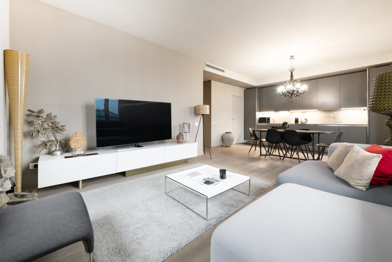 trilocale finemente arredato totalmente accessoriato, composto da soggiorno, due camere e due bagni. Appartamento dotato di wifi con contratto flat senza limiti di traffico. Riscaldamento centralizzato ed aria condizionata, TV LCD a disposizione degli ospiti. Cucina con frigo, congelatore, lavastoviglie. Ripostiglio attrezzato con lavatrice e asciugatrice, ferro da stiro e relativo asse.