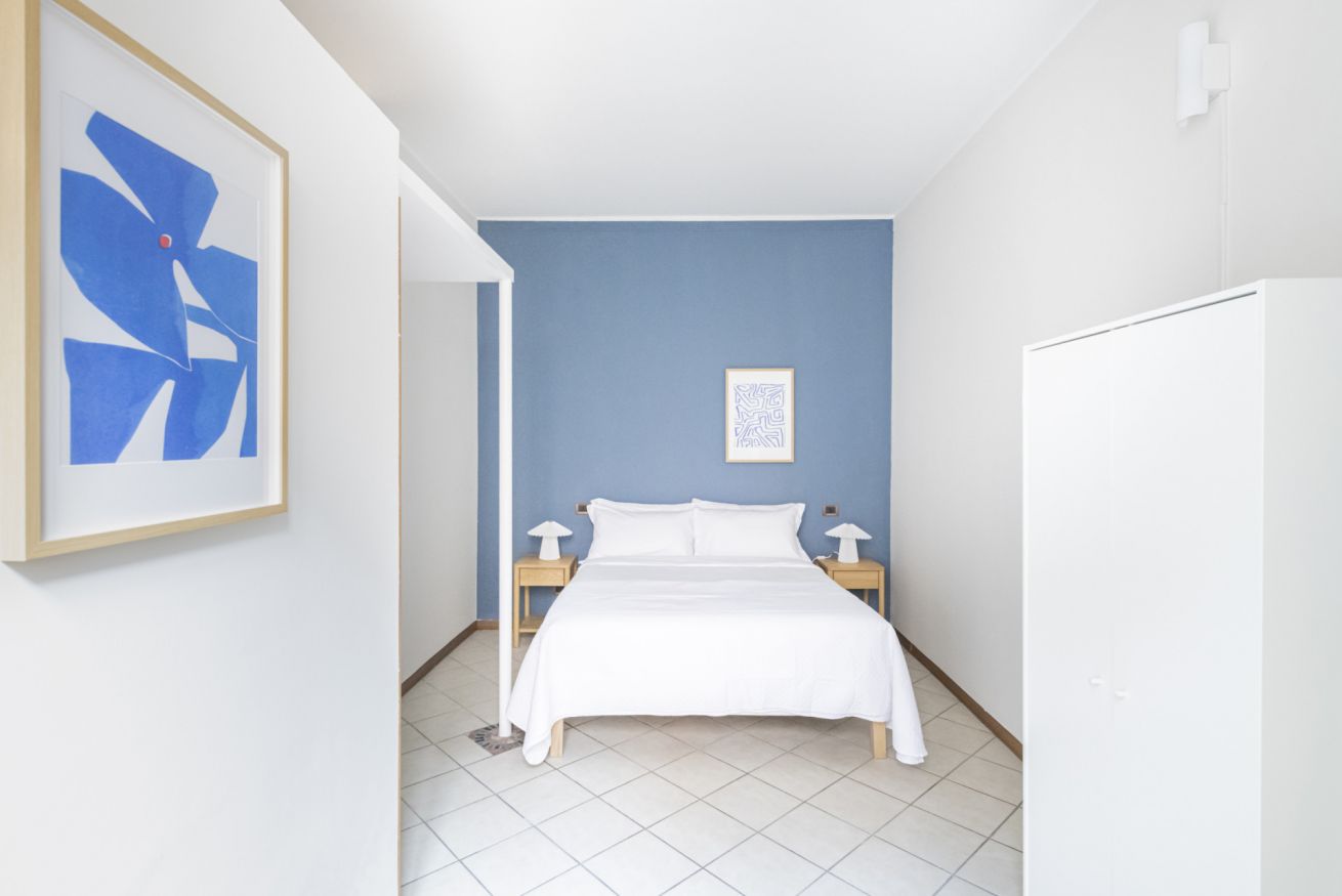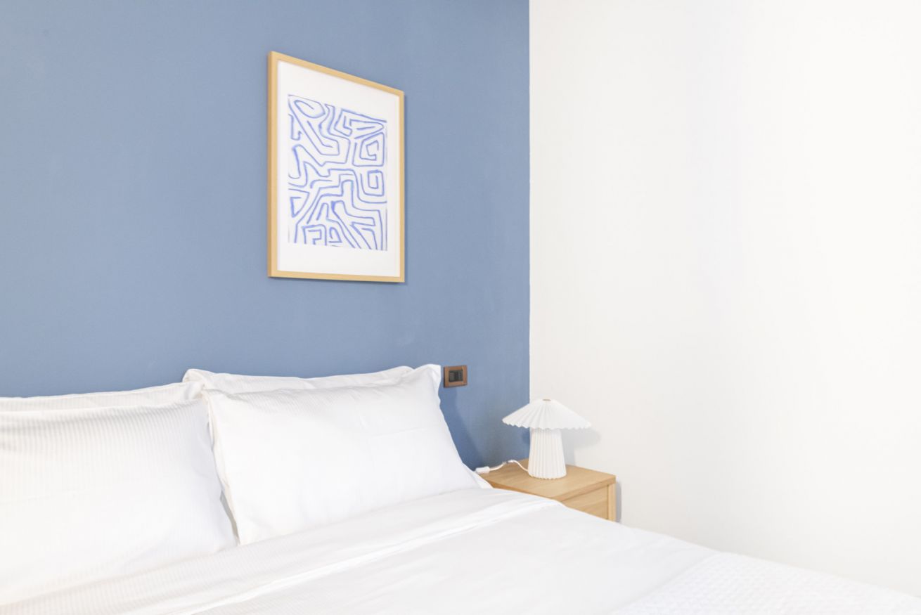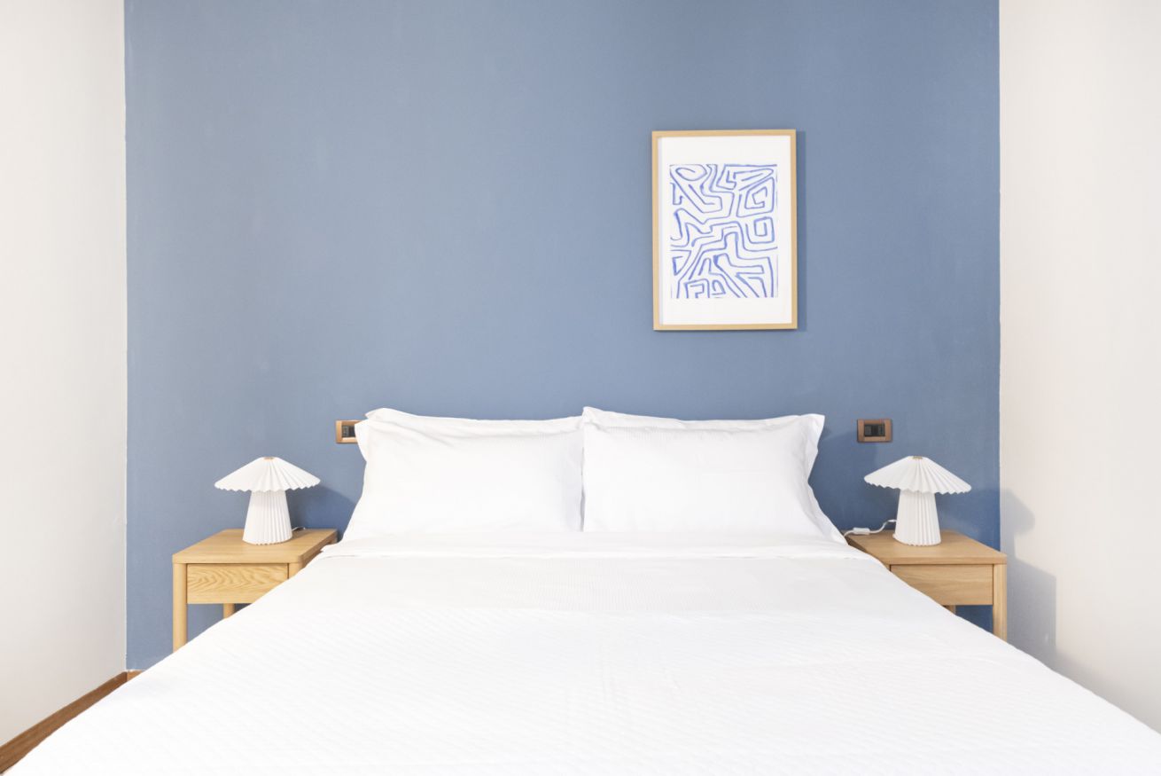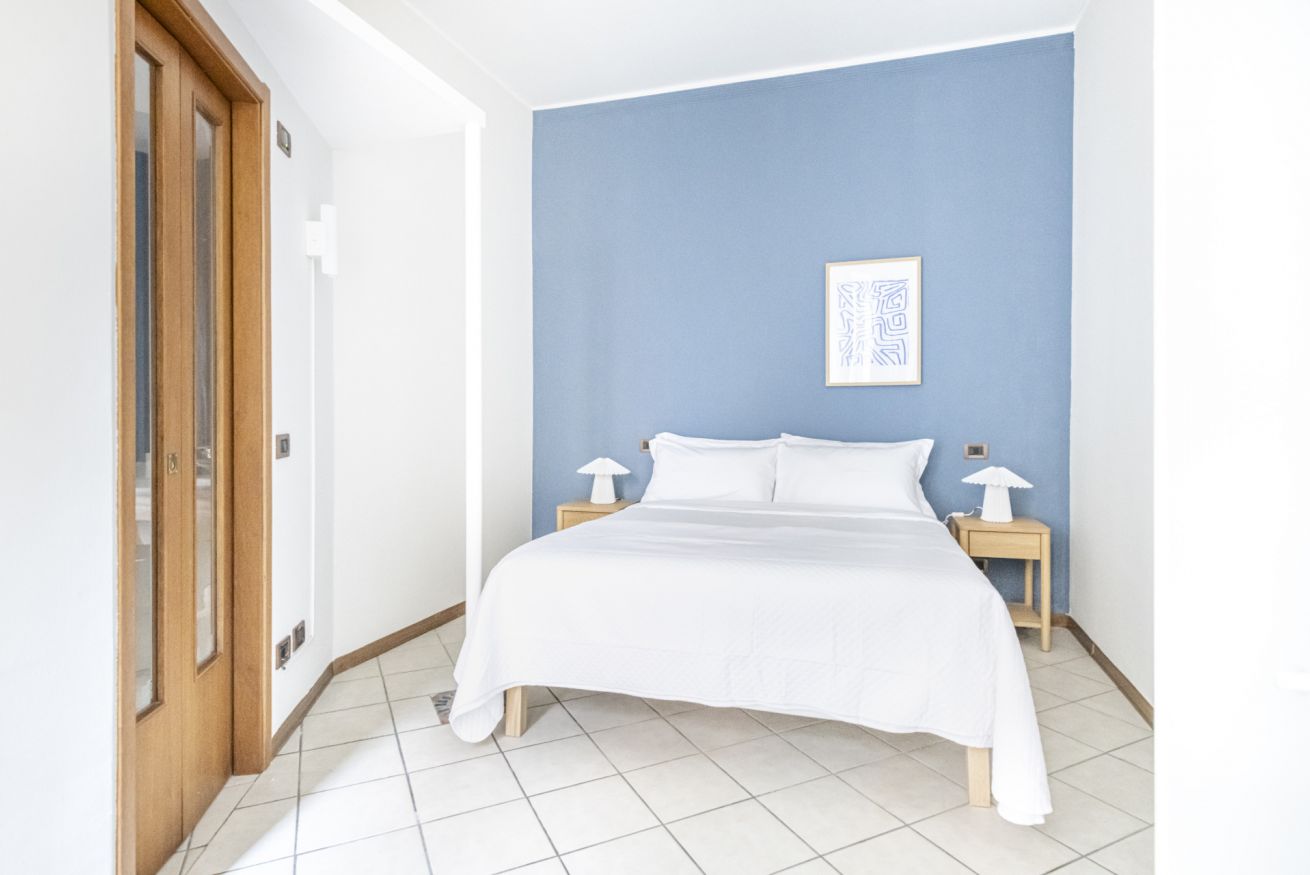 La camera matrimoniale, elegante e rilassante, è caratterizzata da una raffinata parete blu, comodini di design e armadio, creando un ambiente intimo e armonioso. Completa l’appartamento un bagno moderno finestrato, dotato di spaziosa doccia walk-in in vetro e finiture contemporanee. Una casa luminosa, accogliente e perfettamente organizzata, ideale per vivere un soggiorno confortevole.