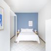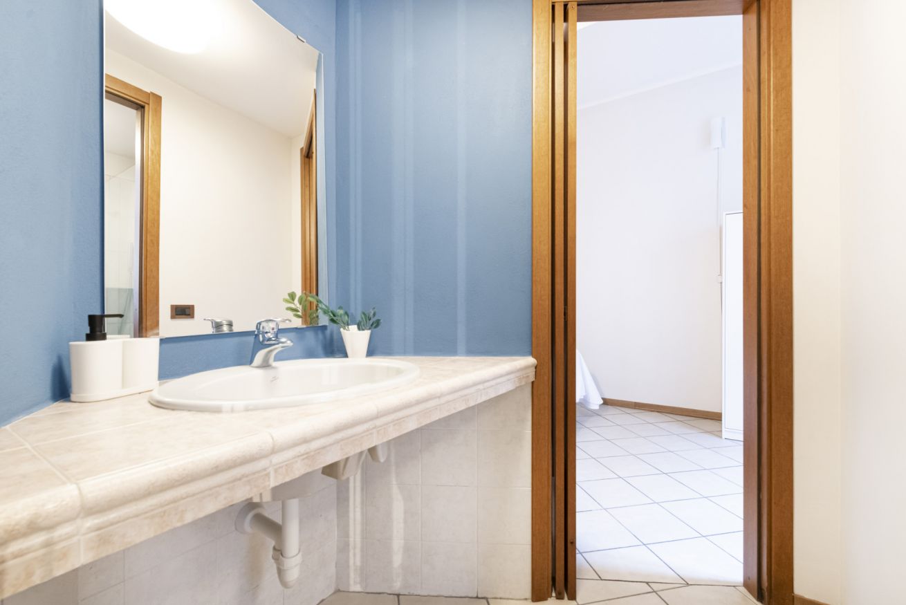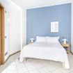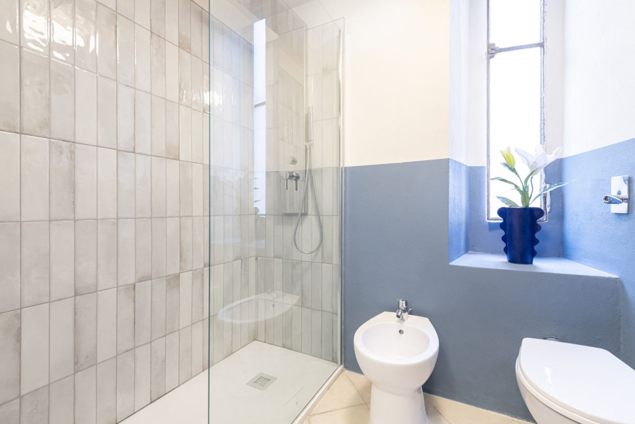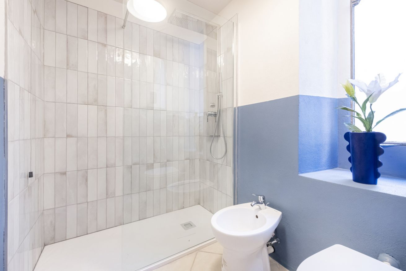 La camera matrimoniale, elegante e rilassante, è caratterizzata da una raffinata parete blu, comodini di design e armadio, creando un ambiente intimo e armonioso. Completa l’appartamento un bagno moderno finestrato, dotato di spaziosa doccia walk-in in vetro e finiture contemporanee. Una casa luminosa, accogliente e perfettamente organizzata, ideale per vivere un soggiorno confortevole.