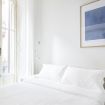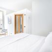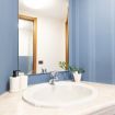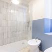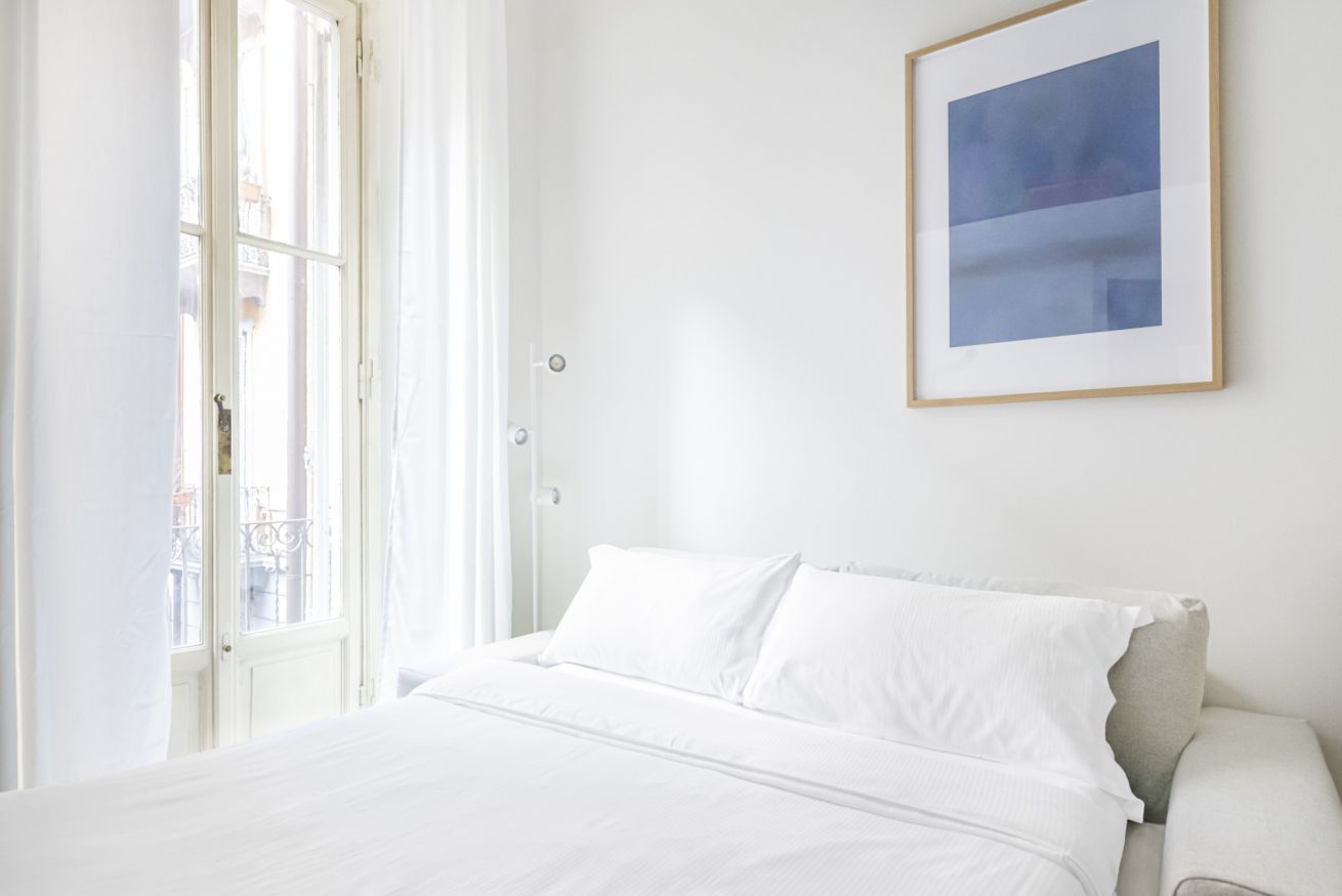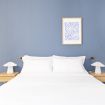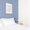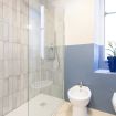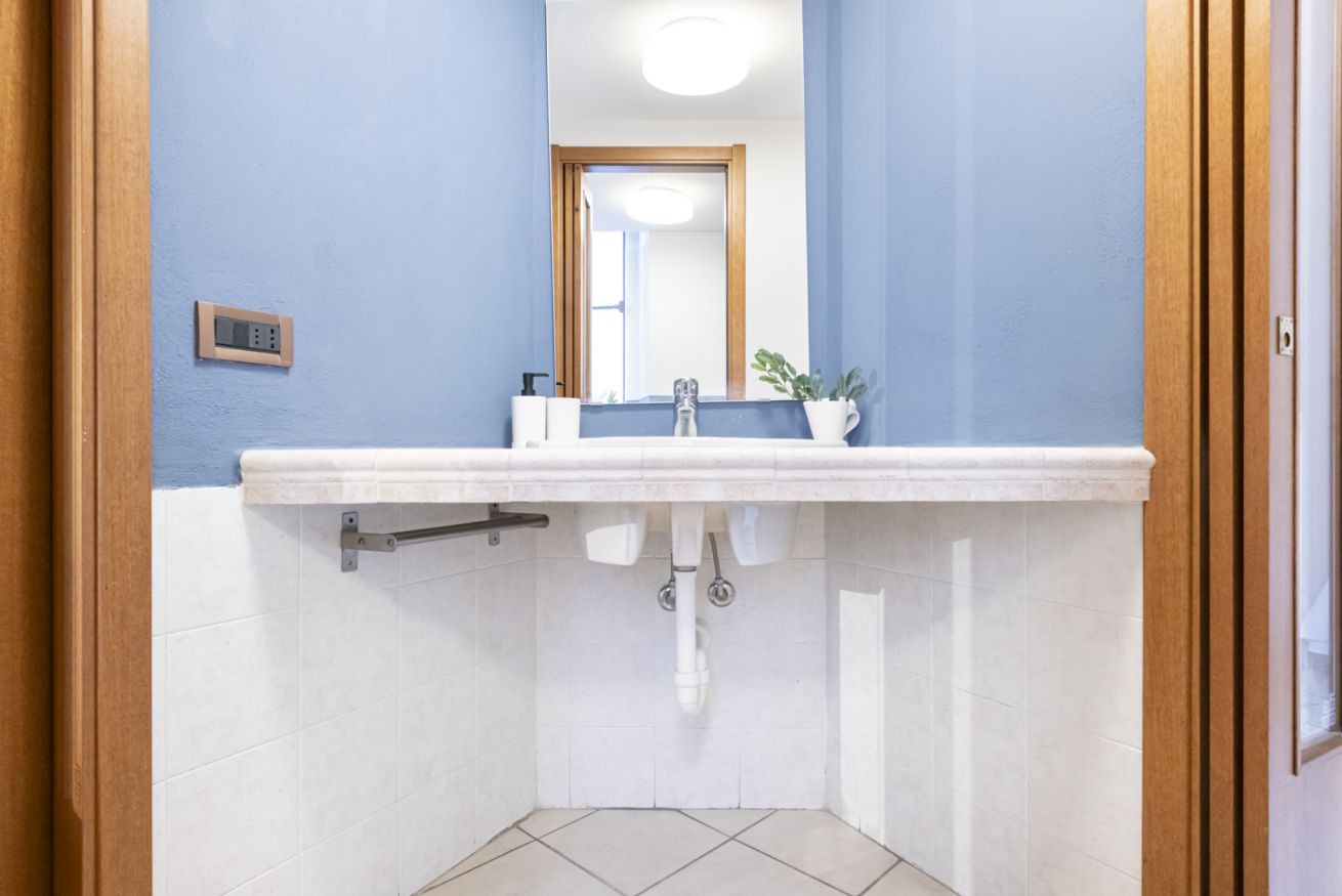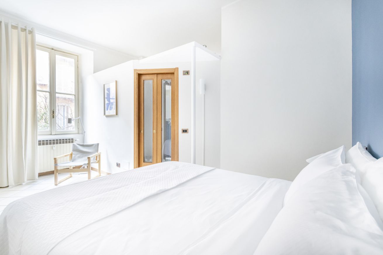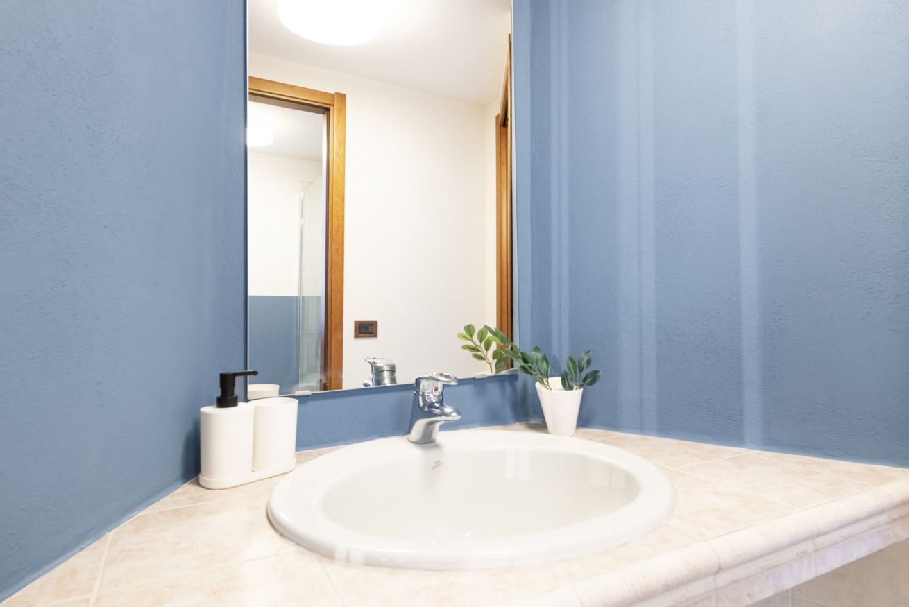 La camera matrimoniale, elegante e rilassante, è caratterizzata da una raffinata parete blu, comodini di design e armadio, creando un ambiente intimo e armonioso. Completa l’appartamento un bagno moderno finestrato, dotato di spaziosa doccia walk-in in vetro e finiture contemporanee. Una casa luminosa, accogliente e perfettamente organizzata, ideale per vivere un soggiorno confortevole.