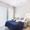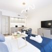 Completamente climatizzato, l'immobile accoglie con un ingresso che conduce a una luminosa zona living, arredata con un elegante divano letto e una grande smart TV a muro, ideale per momenti di relax e intrattenimento. Adiacente, una zona pranzo perfetta per pasti veloci si integra armoniosamente con un angolo cottura moderno e funzionale, equipaggiato con elettrodomestici di ultima generazione.