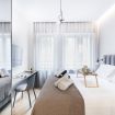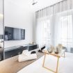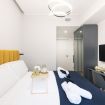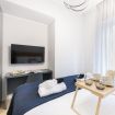 Varcando la soglia d'ingresso, si viene accolti da una luminosa e raffinata zona living, arredata con un elegante divano letto che invita al relax, di fronte a una maestosa smart TV a muro, perfetta per serate all'insegna dell'intrattenimento. Adiacente, una zona pranzo pensata per pasti veloci si integra armoniosamente con un angolo cottura moderno e funzionale, dotato di elettrodomestici di ultima generazione e finiture di pregio.
