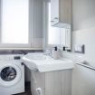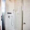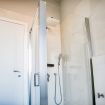 Il bagno, dal design contemporaneo, è dotato di una spaziosa doccia in vetro, offrendo un'esperienza di benessere.