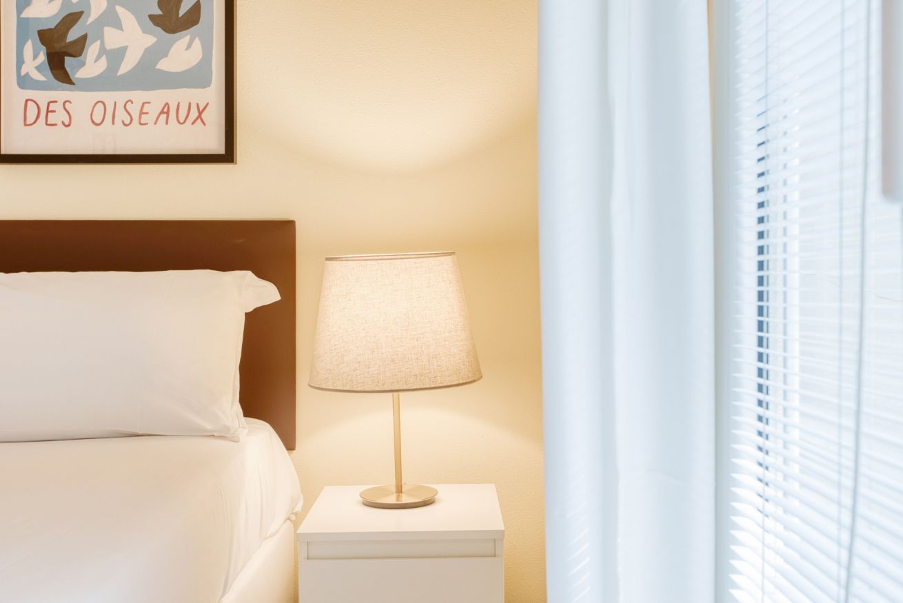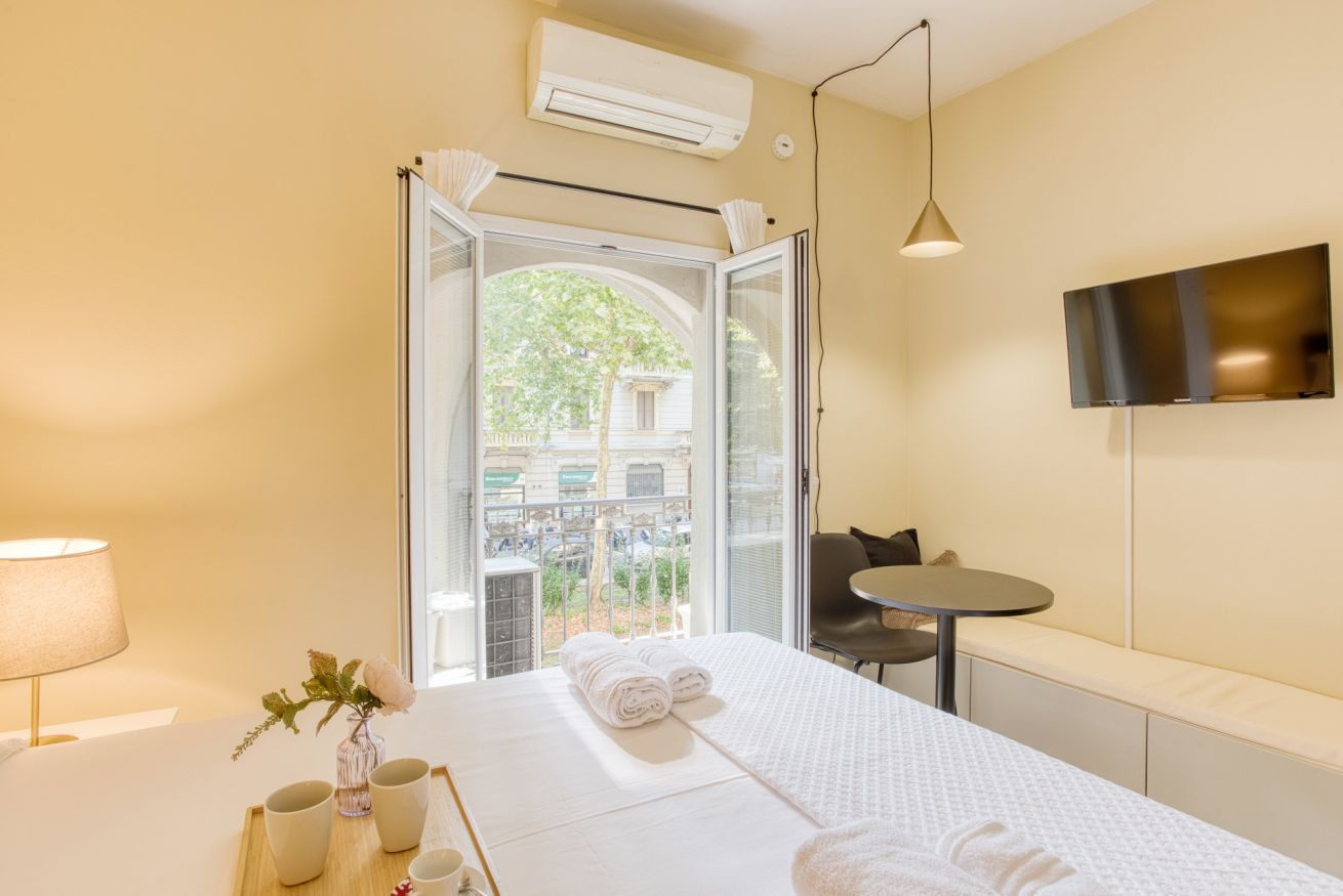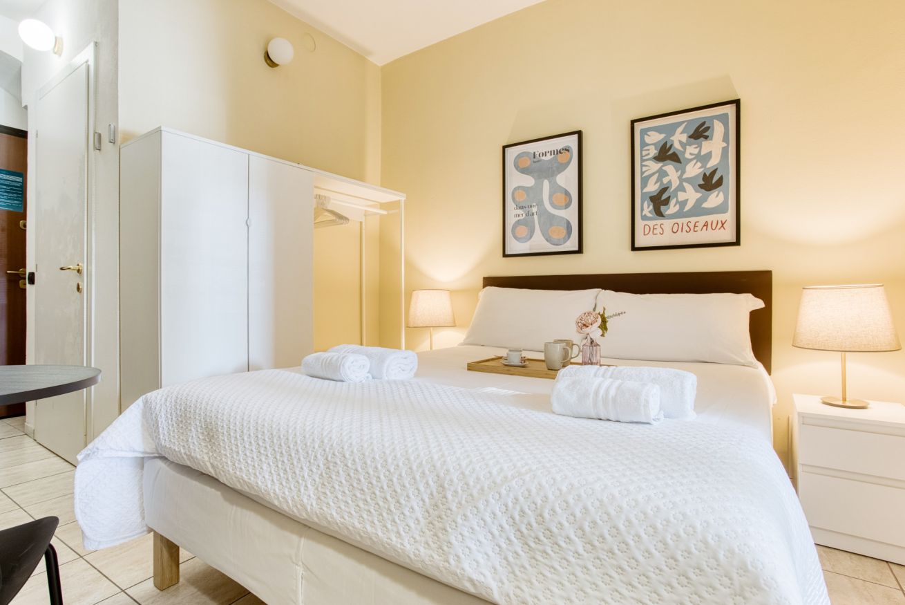 Varca la soglia di questo raffinato monolocale milanese e lasciati abbracciare da un’atmosfera intima e luminosa. Il cuore dello spazio è una zona living accogliente, dominata da un letto matrimoniale dai tessuti candidi, adornato da dettagli ricercati come un vassoio con tazza e fiori e illuminato dalla luce naturale che filtra da un balconcino interno, silenzioso e riservato: l’angolo perfetto per iniziare la giornata con serenità.