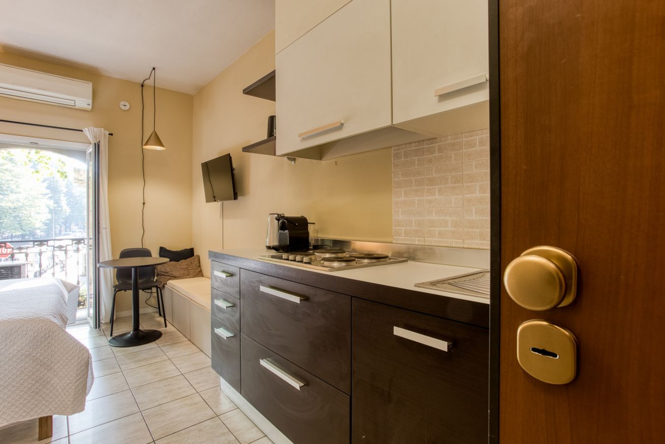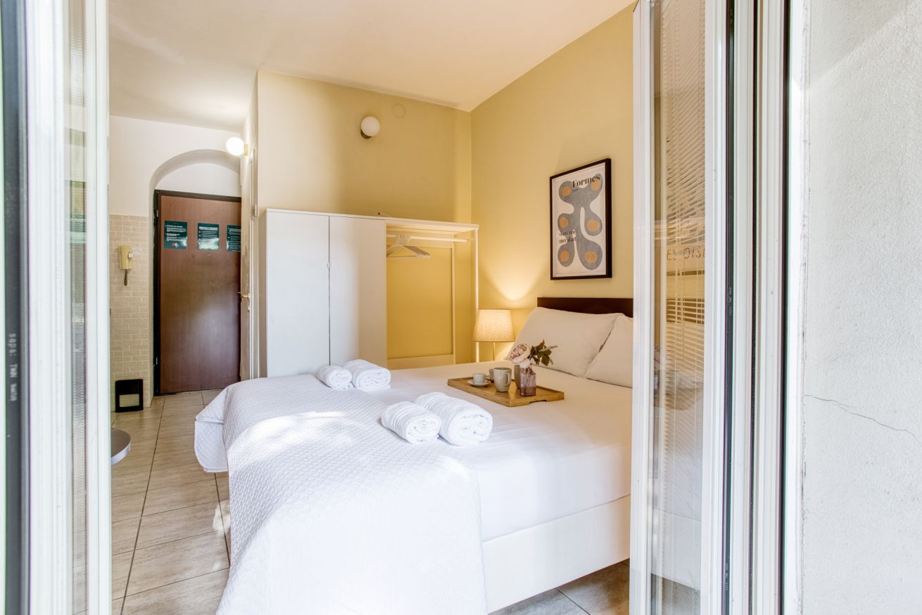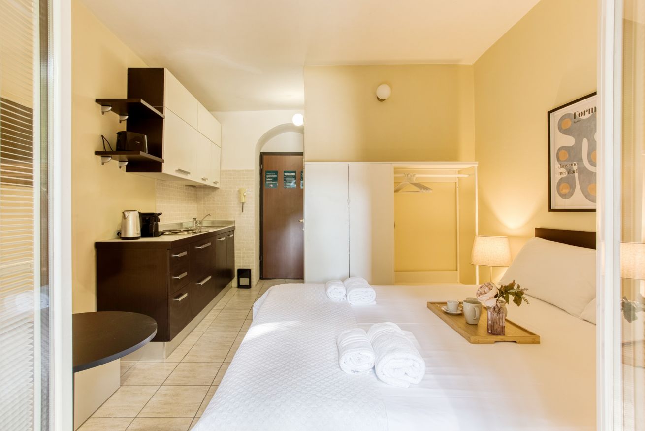 Varca la soglia di un monolocale luminoso, al primo piano senza ascensore affacciato su un suggestivo balcone. Una camera da letto matrimoniale con rifiniture eleganti. La zona pranzo, intima con tavolino tondo, è ideale per colazioni rilassate o momenti veloci. La cucina compatta, con mobili moderni ed elettrodomestici, unisce praticità e stile. Il bagno è un comfort essenziale: doccia in cristallo, lavabo funzionale e lavatrice integrata, pensato per la comodità quotidiana.
