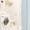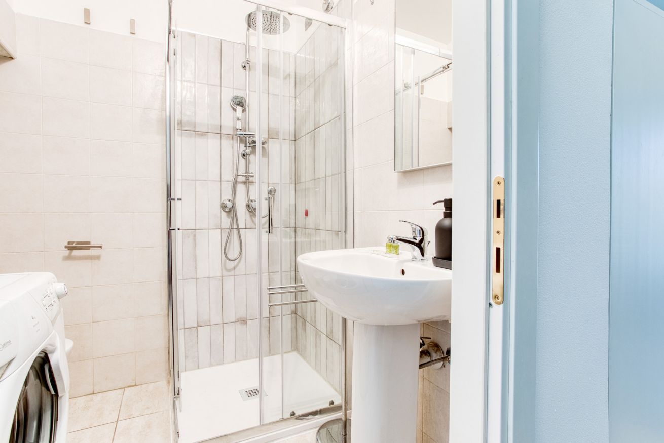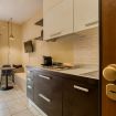 La cucina, compatta ma elegante, sfoggia finiture scure e moderne, con piano cottura e macchina per caffè pronti a coccolare i tuoi momenti di relax. Accanto, un piccolo tavolo rotondo abbinato a sedie nere minimal sottolinea praticità e stile, mentre il bagno, funzionale e ben curato, offre una doccia in vetro cristallino, lavabo bianco e lavatrice, un perfetto mix di estetica e comfort quotidiano.