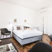 Stupendo appartamento al 6° piano con ascensore, interamente climatizzato. Dotato di ingresso, moderna cucina lineare con elettrodomestici e penisola, una zona pranzo e un’area living con comodo divano letto e smart TV. La spaziosa camera matrimoniale include un ampio armadio a muro e un elegante divano di design. Il bagno nuovo, dispone di una grande doccia. Nota di eleganza, uno stupendo parquet in legno scuro posato a lisca di pesce e tocchi di design completano questo raffinato ambiente.
