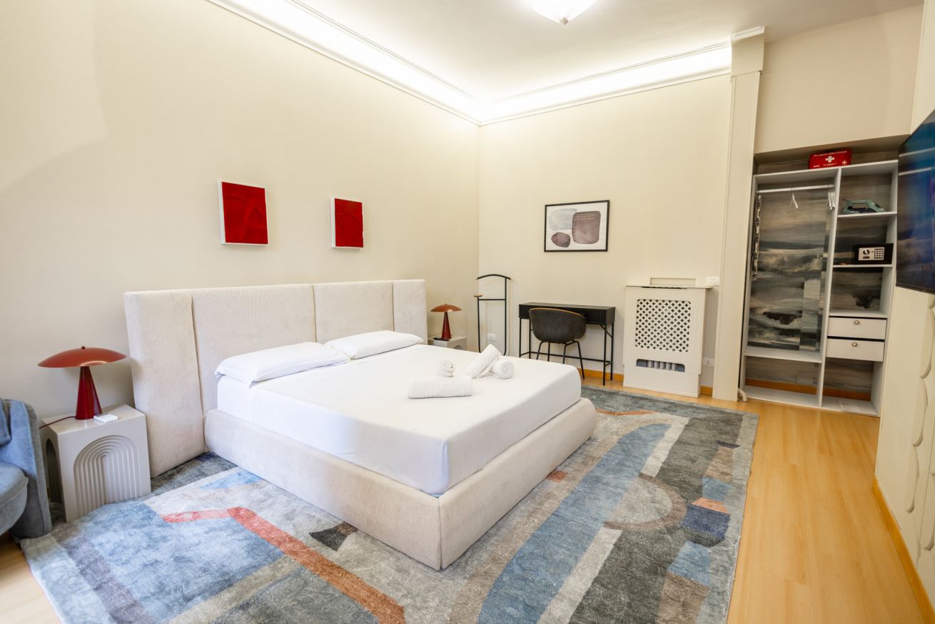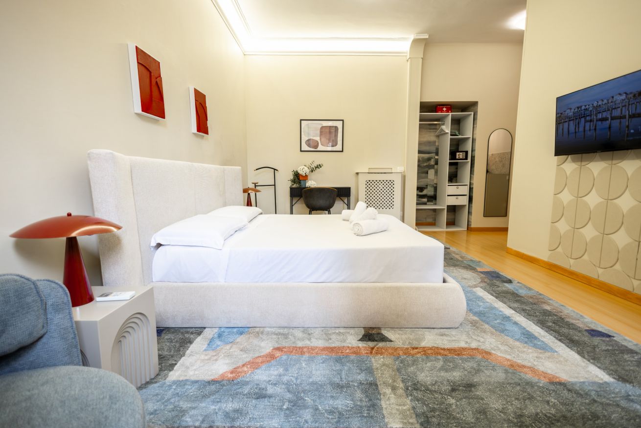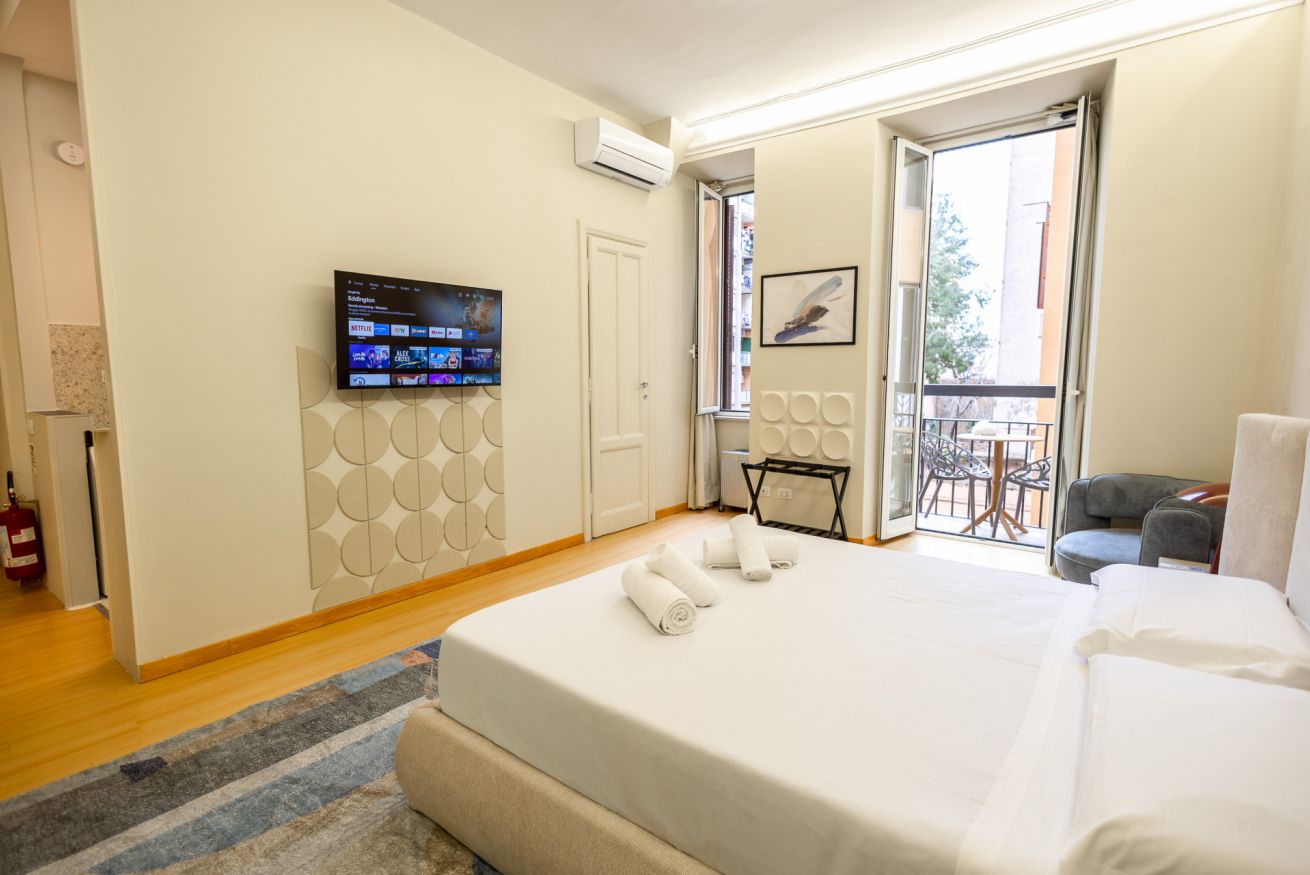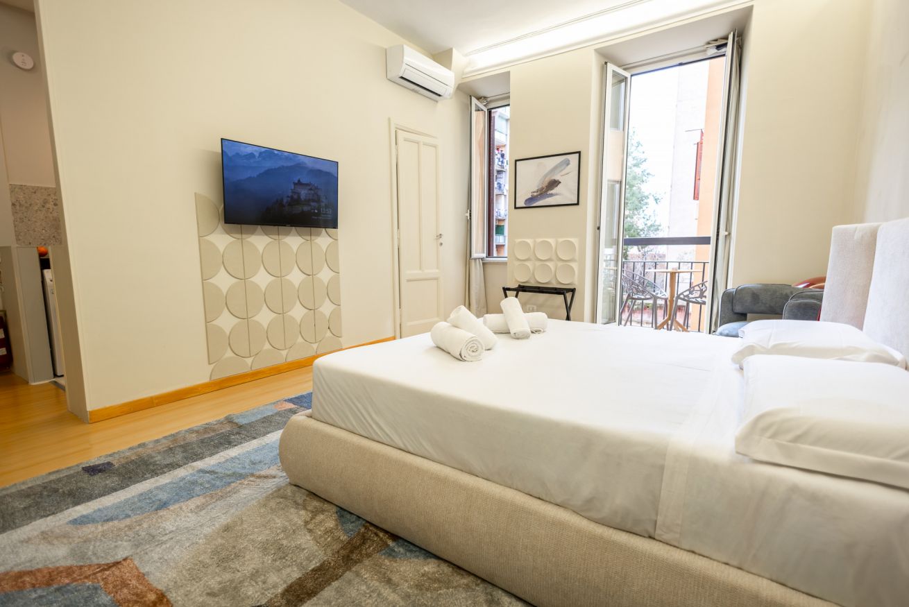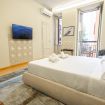 La zona notte, ampia e scenografica, si distingue per il grande letto matrimoniale, tessili morbidi e una parete TV di design con pannellatura decorativa che dona carattere e profondità all’ambiente. Le ampie finestre e l’accesso al balconcino rendono lo spazio arioso e piacevole, ideale per momenti di relax. La cucina, compatta ma completa di elettrodomestici, è organizzata in modo intelligente per garantire massima praticità senza rinunciare all’estetica.
