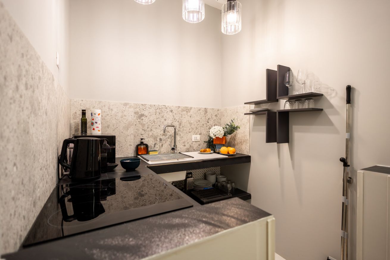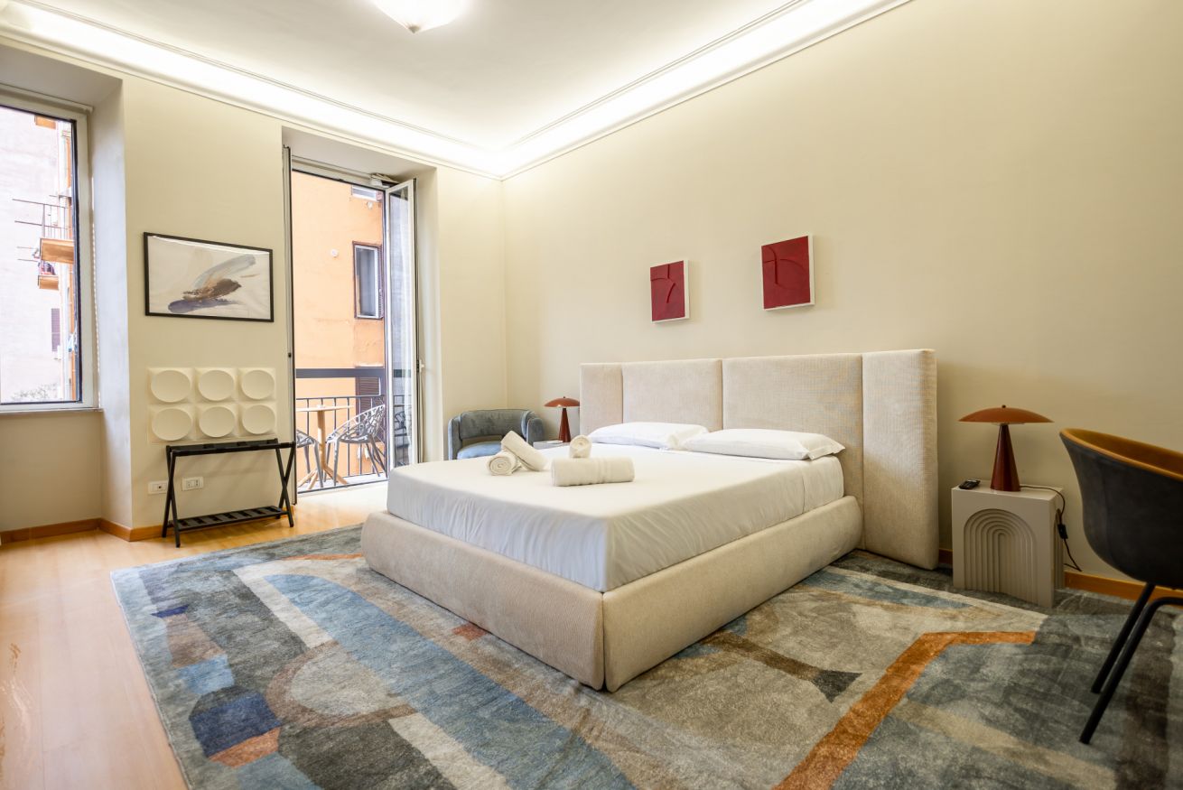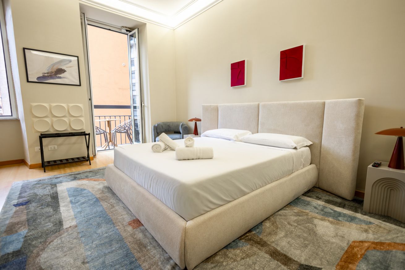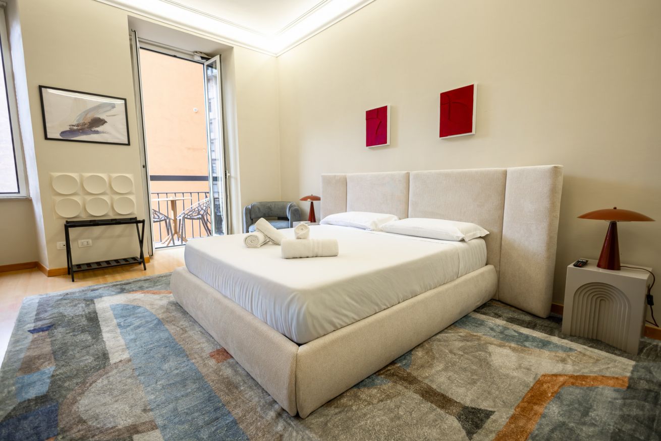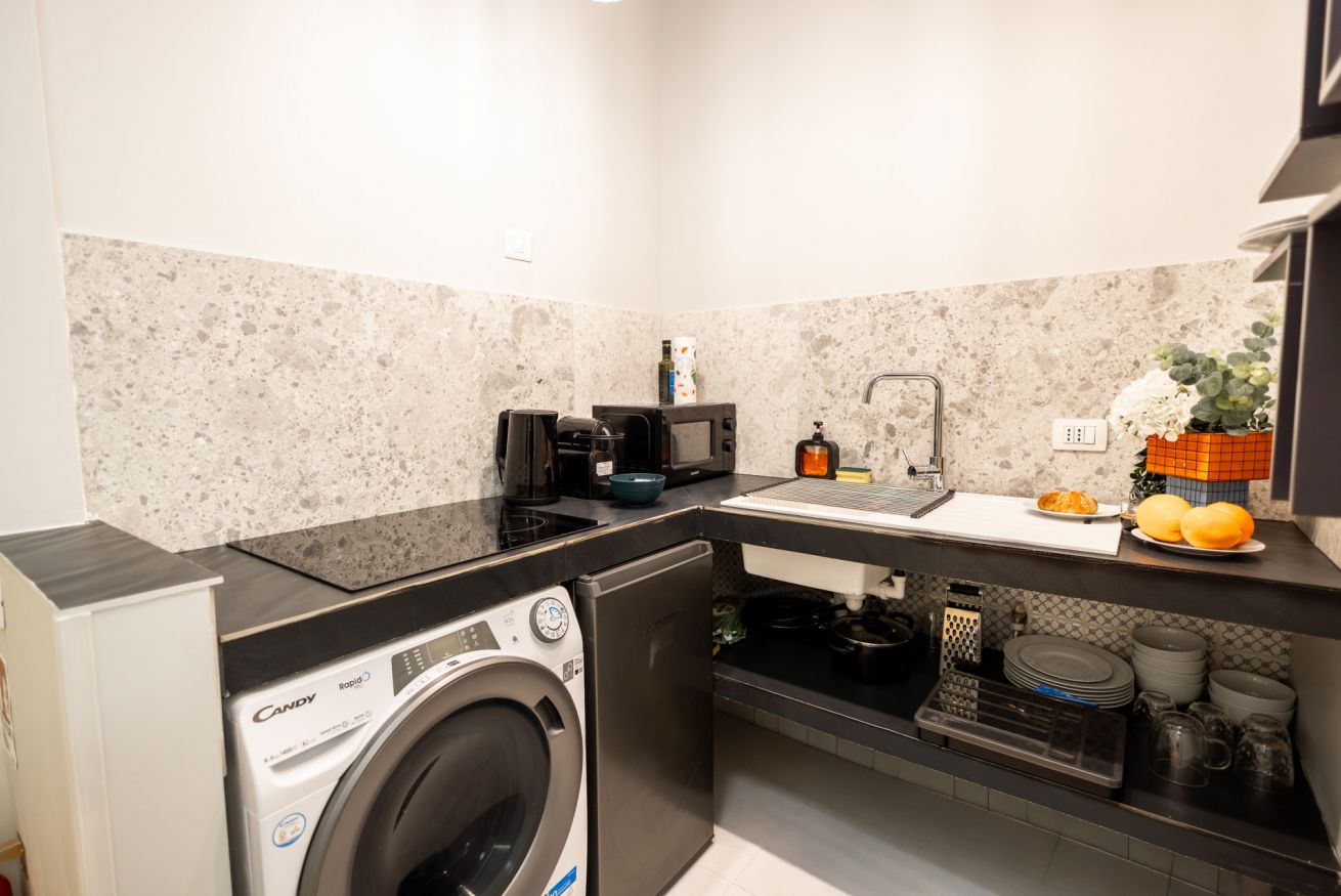 La zona notte, ampia e scenografica, si distingue per il grande letto matrimoniale, tessili morbidi e una parete TV di design con pannellatura decorativa che dona carattere e profondità all’ambiente. Le ampie finestre e l’accesso al balconcino rendono lo spazio arioso e piacevole, ideale per momenti di relax. La cucina, compatta ma completa di elettrodomestici, è organizzata in modo intelligente per garantire massima praticità senza rinunciare all’estetica.