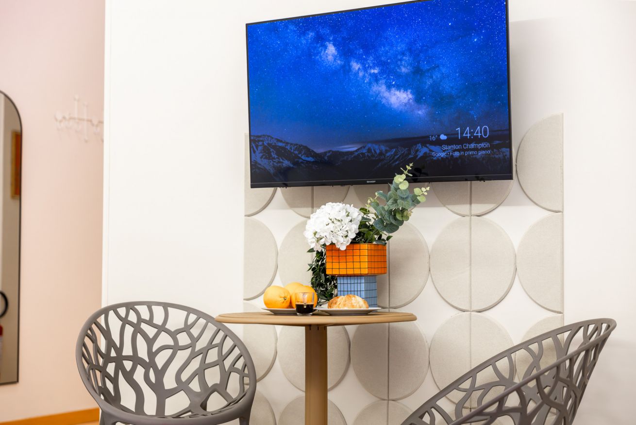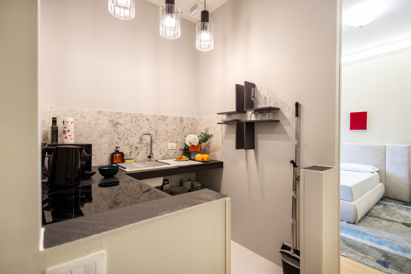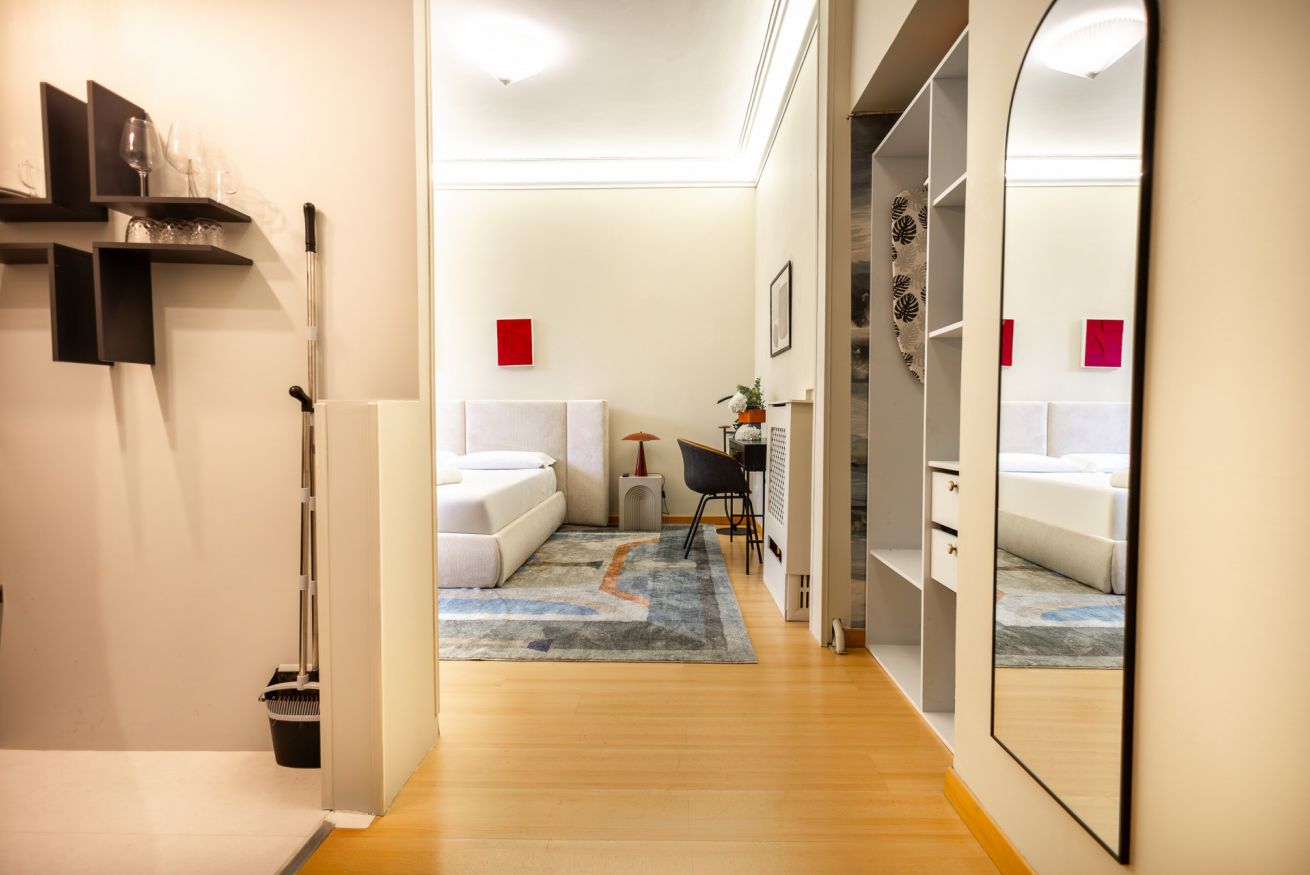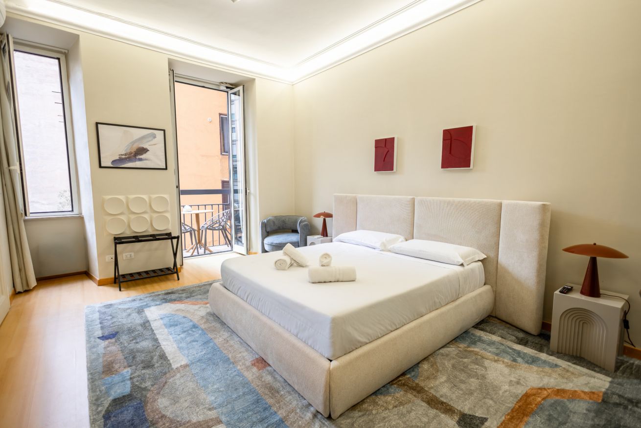 La zona notte, ampia e scenografica, si distingue per il grande letto matrimoniale, tessili morbidi e una parete TV di design con pannellatura decorativa che dona carattere e profondità all’ambiente. Le ampie finestre e l’accesso al balconcino rendono lo spazio arioso e piacevole, ideale per momenti di relax. La cucina, compatta ma completa di elettrodomestici, è organizzata in modo intelligente per garantire massima praticità senza rinunciare all’estetica.