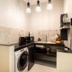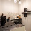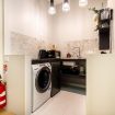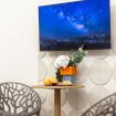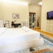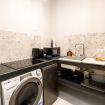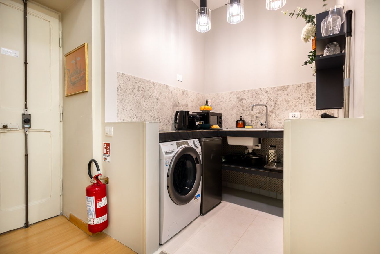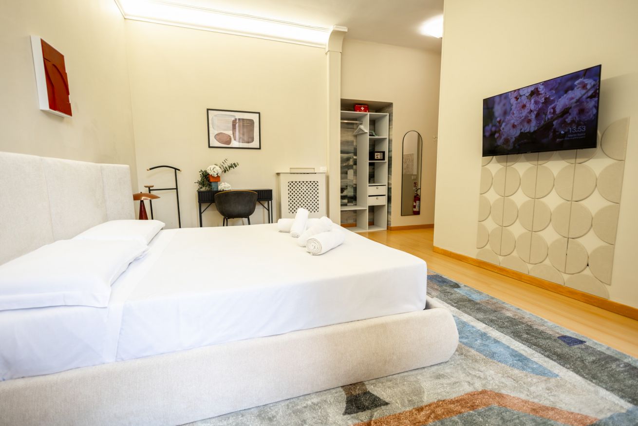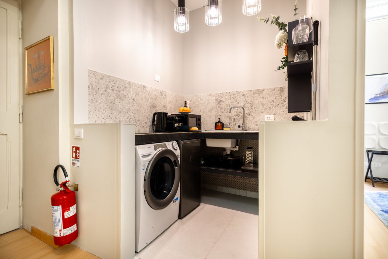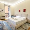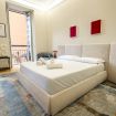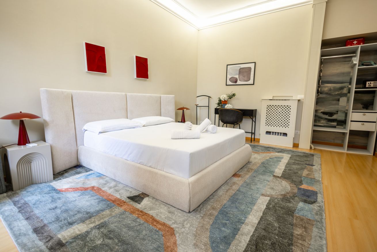 La zona notte, ampia e scenografica, si distingue per il grande letto matrimoniale, tessili morbidi e una parete TV di design con pannellatura decorativa che dona carattere e profondità all’ambiente. Le ampie finestre e l’accesso al balconcino rendono lo spazio arioso e piacevole, ideale per momenti di relax. La cucina, compatta ma completa di elettrodomestici, è organizzata in modo intelligente per garantire massima praticità senza rinunciare all’estetica.