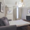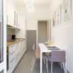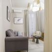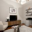 La zona living è uno spazio sofisticato e versatile, con comodo divano letto matrimoniale, perfetto per accogliere ospiti, e una smart TV, ideale per momenti di relax. A seguire, una cucina lineare di ultima generazione, dotata di elettrodomestici moderni e un elegante tavolo da pranzo, si affaccia su un delizioso terrazzino privato, perfetto per colazioni all’aperto o per rilassarsi immersi in un’atmosfera esclusiva.